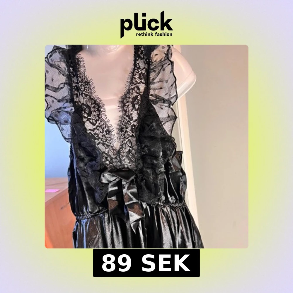 Säljer en svart med djup v-ringning, spetsdetaljer och volanger upptill. Klänningen har ett brett band i midjan