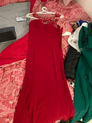 Lång röd klänning som har använts kanske 3 gånger Max. Väldigt fin o ser ut som ny.