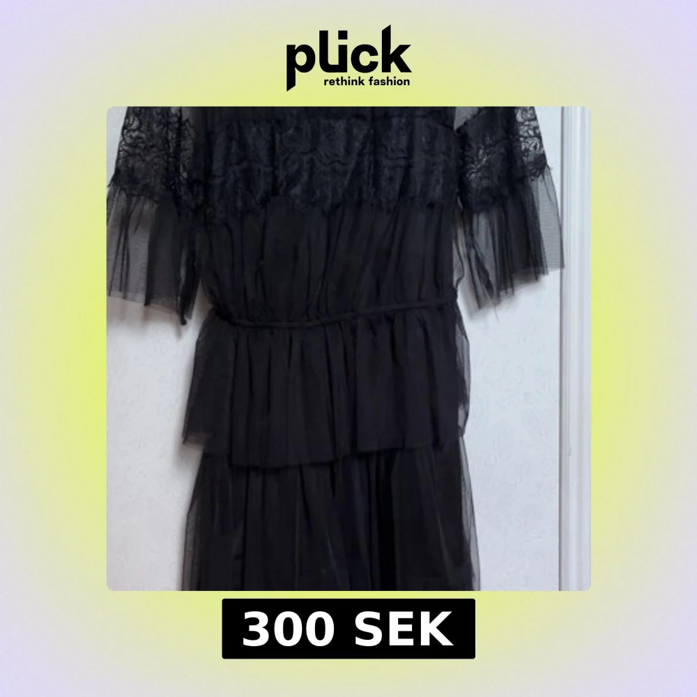 Elegant svart klänning med spetsdetaljer och volanger. Klänningen har trekvartsärmar och en vacker struktur som ger en romantisk känsla. Perfekt för speciella tillfällen. ALDRIG ANVÄND! ny pris 600kr