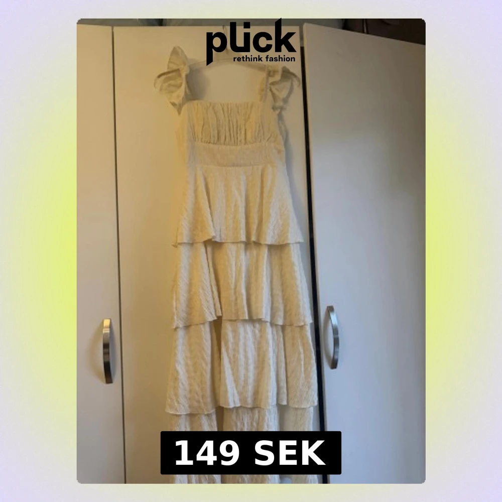 Superfin långklänning i ljus beige med flera volanger och smockad överdel. Axelbanden har volangdetaljer som ger en romantisk känsla. Klänningen är tillverkad i ett lätt, krinklat tyg som känns luftigt och somrigt.