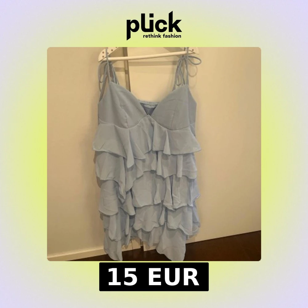 Supersöt ljusblå kortklänning med flera lager volanger och smala axelband som knyts. Klänningen har v-ringad urringning och en luftig, flowy känsla. Perfekt för sommarens alla tillfällen och ger en romantisk vibe.