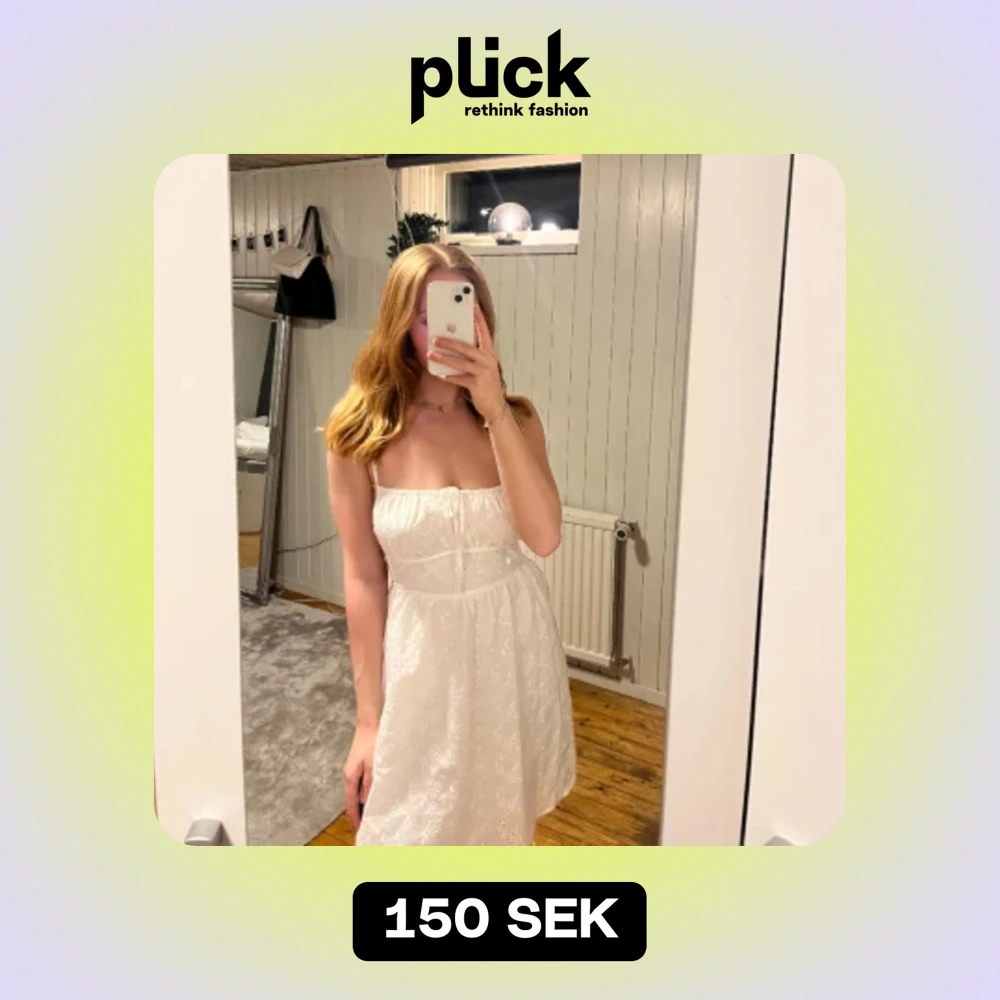 Vit kort klänning med spets och volang - Supersöt vit kort klänning med broderade spetsdetaljer, omlott-v-ringning och volangkant. Armarna har knappar så man kan stänga, se bild 3. Och en dragkedja på vänster sidan för att enklare få på sig den. Står strl 38 och den passar mig som brukar ha S/M i kläder. Lagom lång på mig som är 168cm. Undra du nått är de bara att skriva