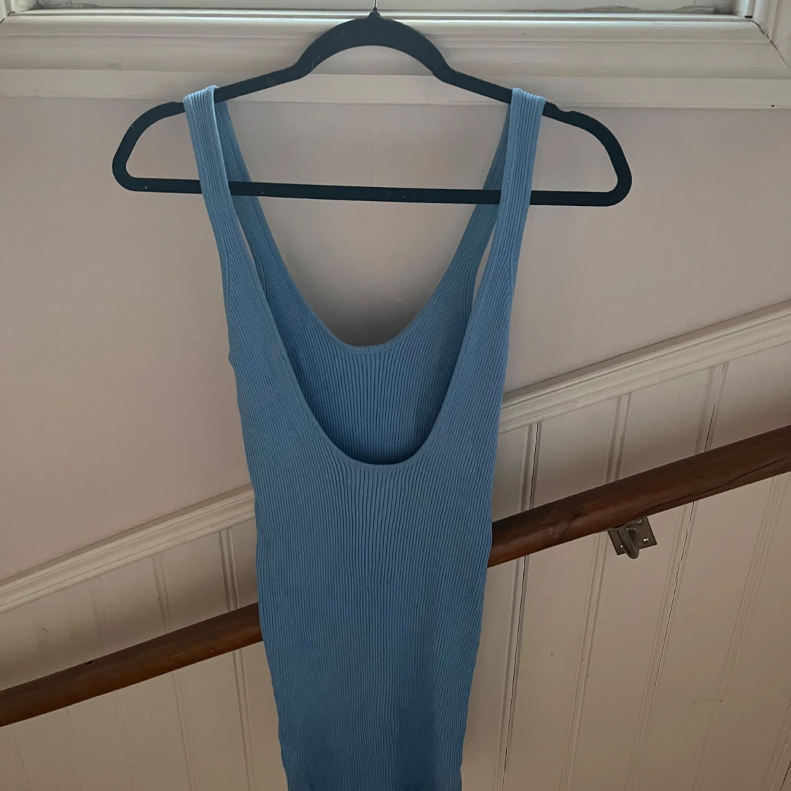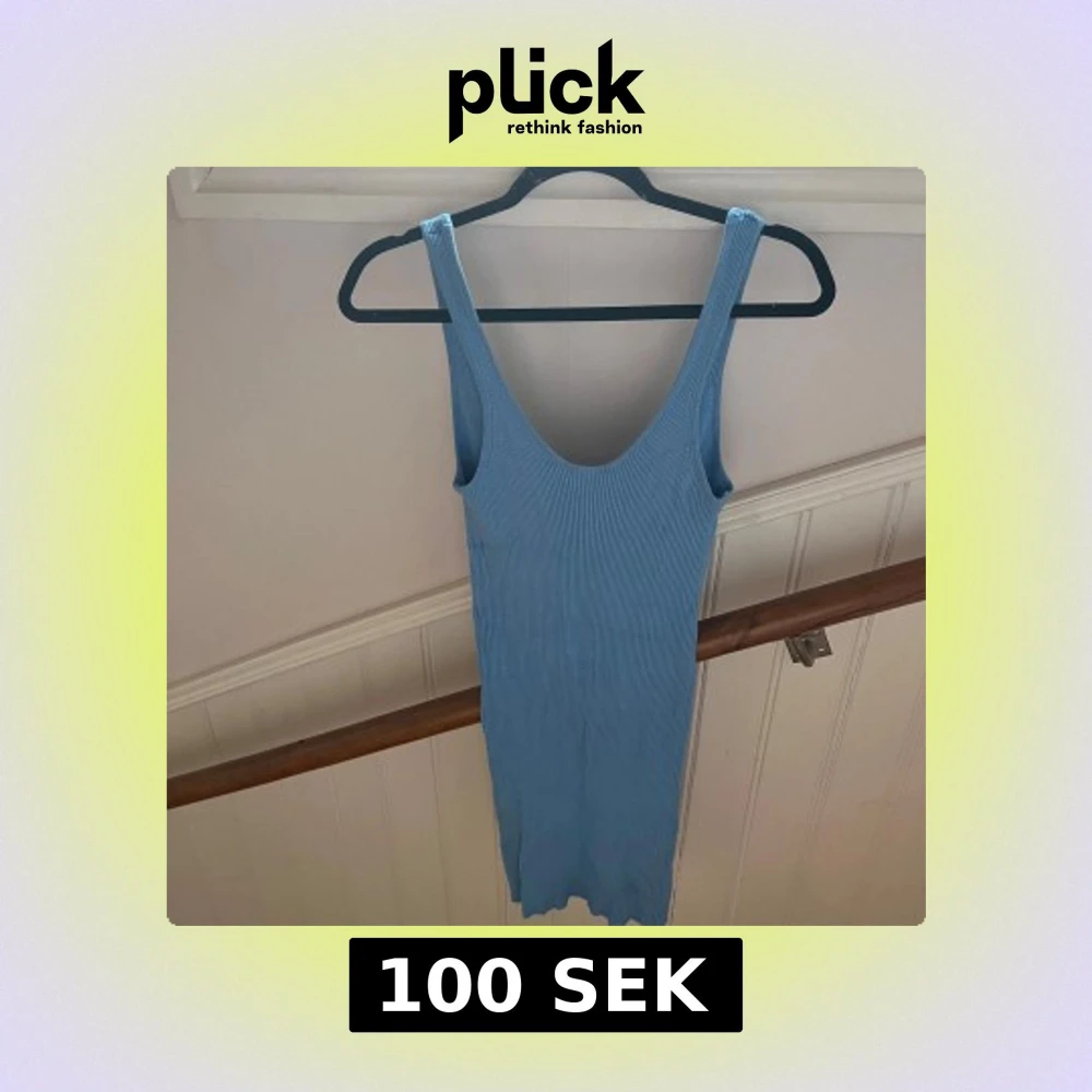 Supersnygg ljusblå ribbad klänning med tight passform och djup urringning både fram och bak. Ärmlös modell med breda axelband, perfekt för varma dagar. Klänningen är kort och har en enkel, stilren look som är lätt att styla.