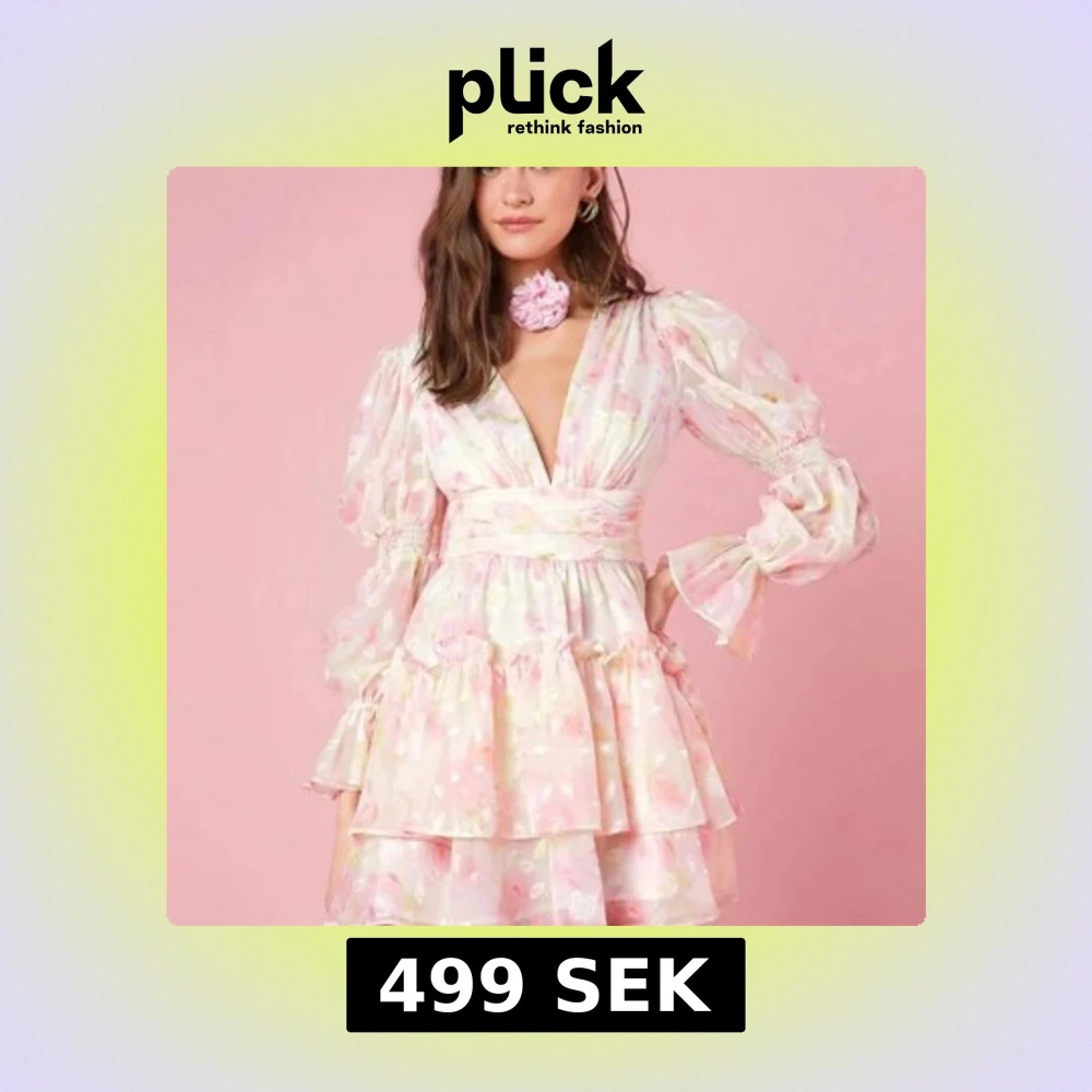 Superfin kortklänning i pastellrosa med blommigt mönster och volanger. Djup v-ringning, markerad midja och puffiga långärmar med smock vid ärmslut. Klänningen har omlottkänsla och är gjord i ett lätt, transparent material med underklänning. Helt slutsåld och är i st S, Aldrig använd.