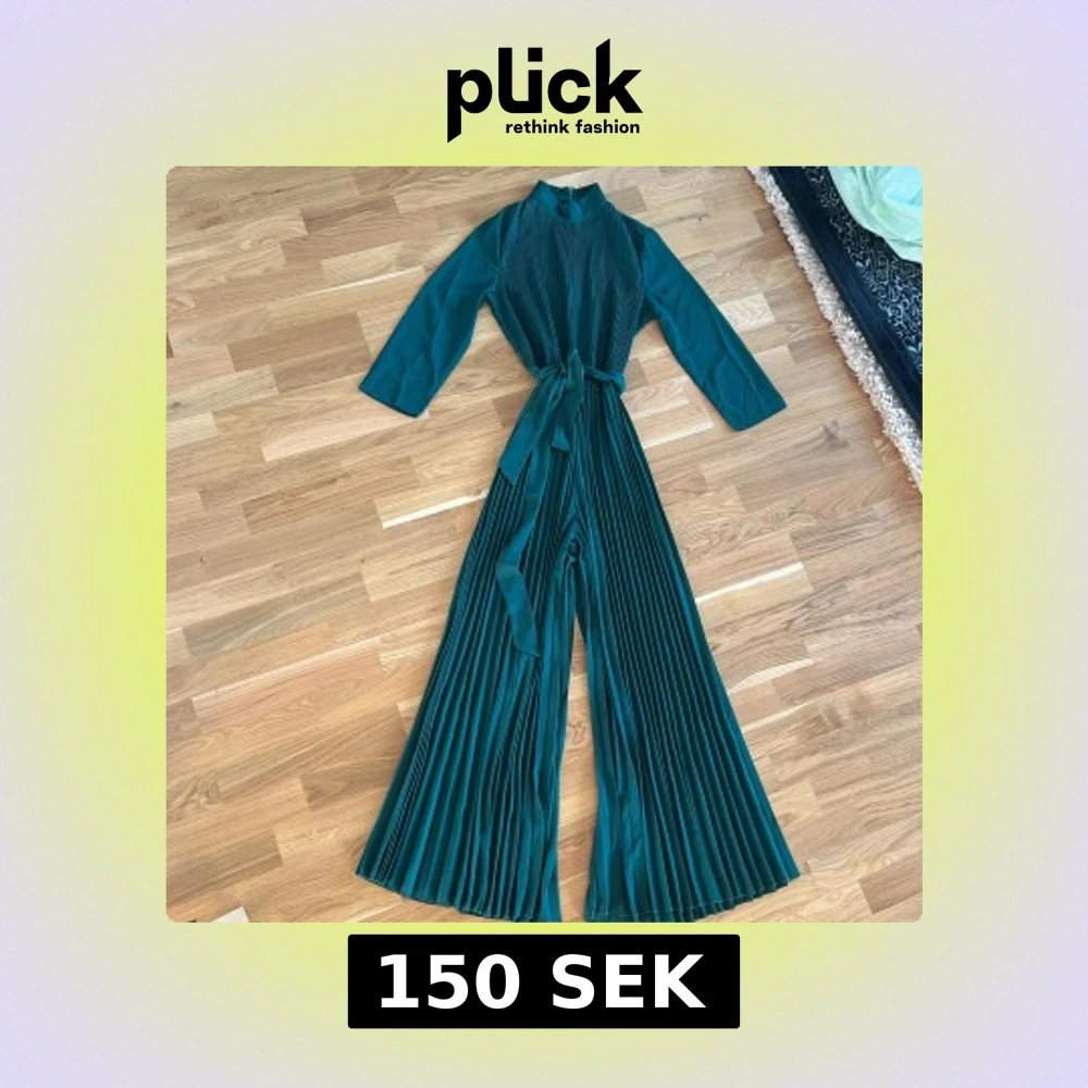 Snygg grön jumpsuit med plisserade ben och knytband i midjan. Den har trekvartsärmar och en hög krage som ger en elegant touch. Perfekt för en stilfull look.