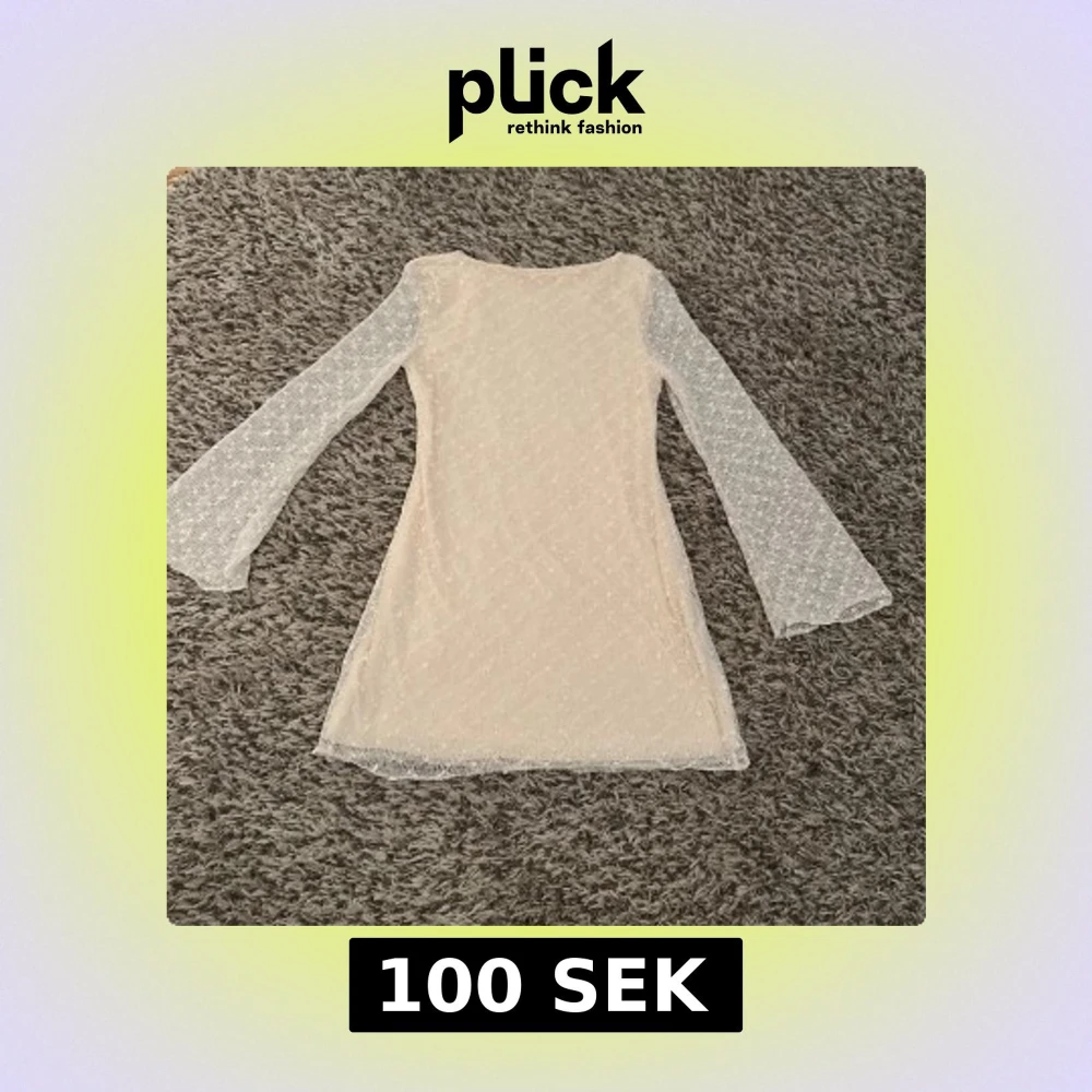 Superfin ljus kort klänning med transparenta, vida långärmar och prickigt spetsmönster. Klänningen har en rak passform men lite utsvängd nedtill.