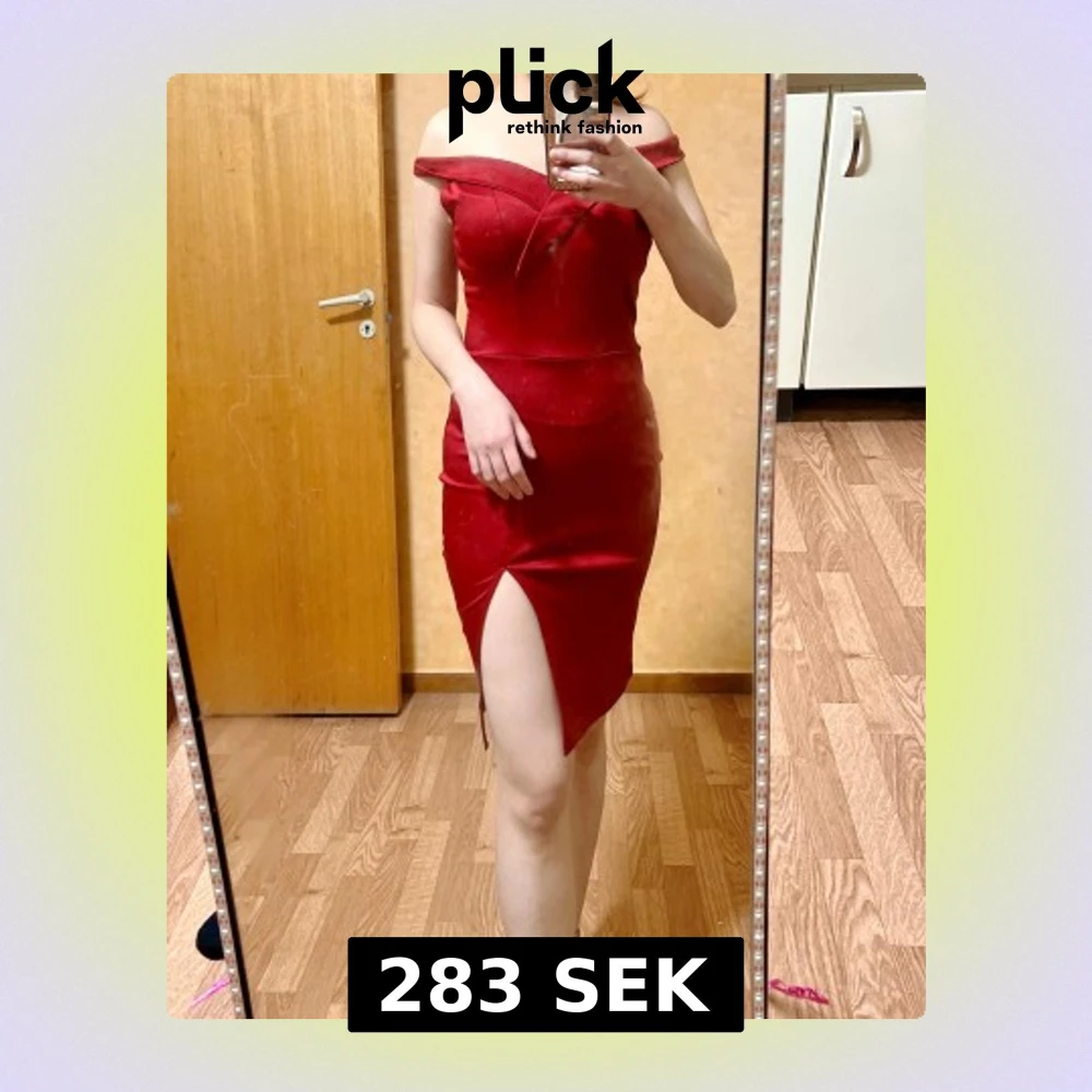 Snygg röd klänning med offshoulder-design och figurnära passform. Klänningen har en markerad v-ringning och en hög slits framtill som ger en cool touch. Materialet är slätt och har en lätt glans. Perfekt för dig som vill sticka ut med en elegant och modern look.