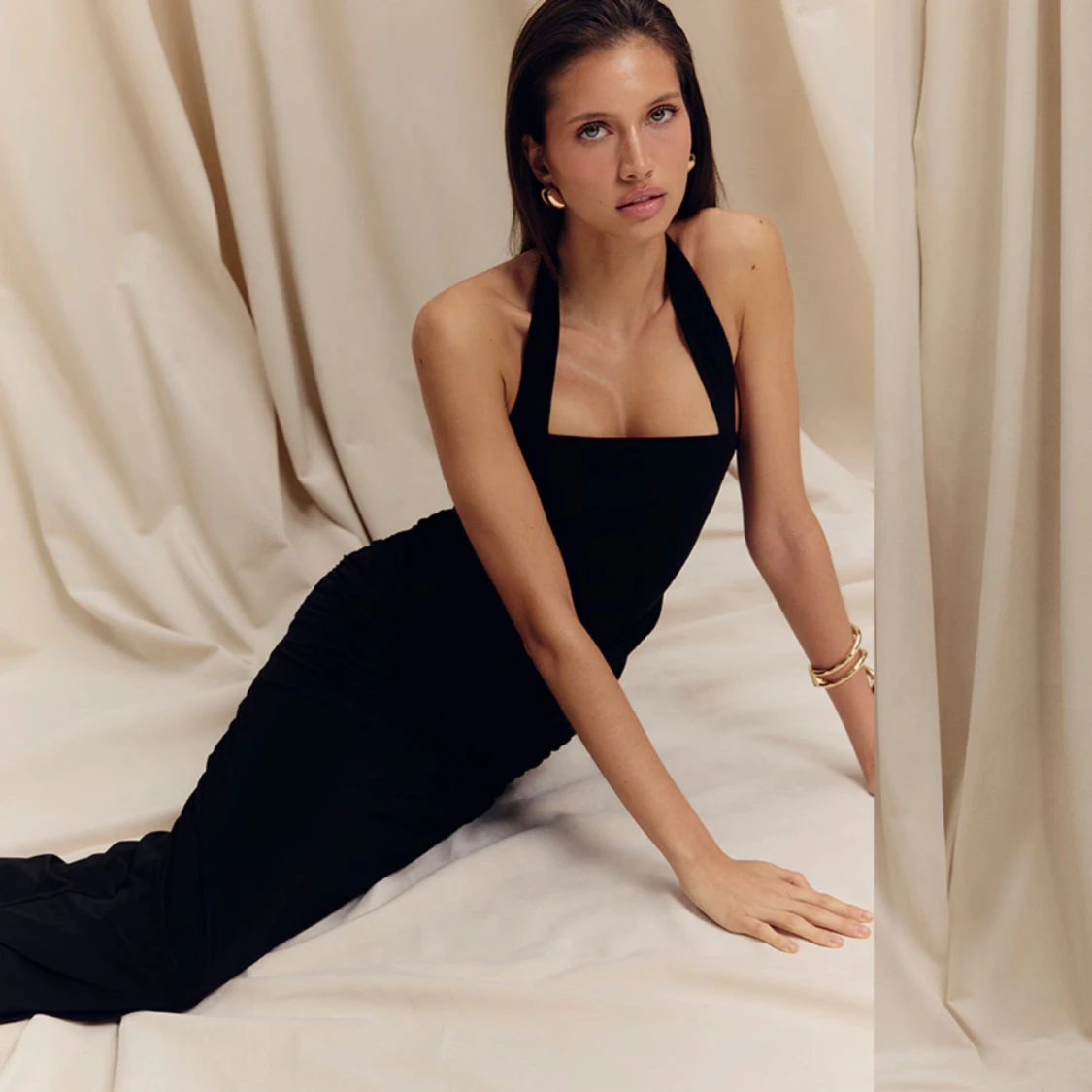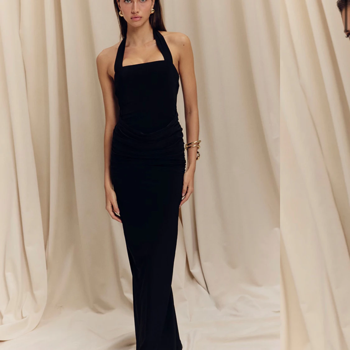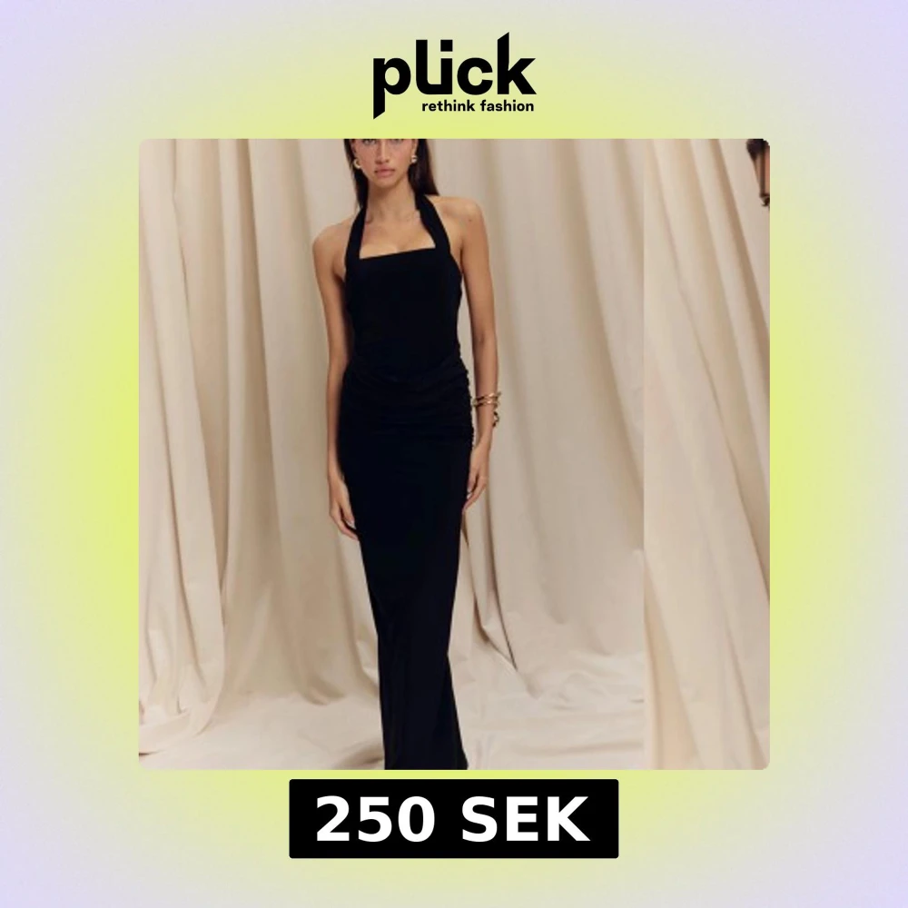 Supersnygg svart långklänning med halterneck och rak urringning. Klänningen har en figurnära passform och draperad midja som ger en elegant siluett. Perfekt för dig som vill sticka ut med en klassisk och stilren look.