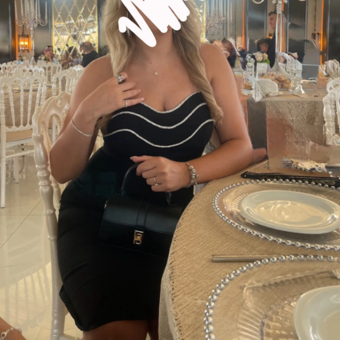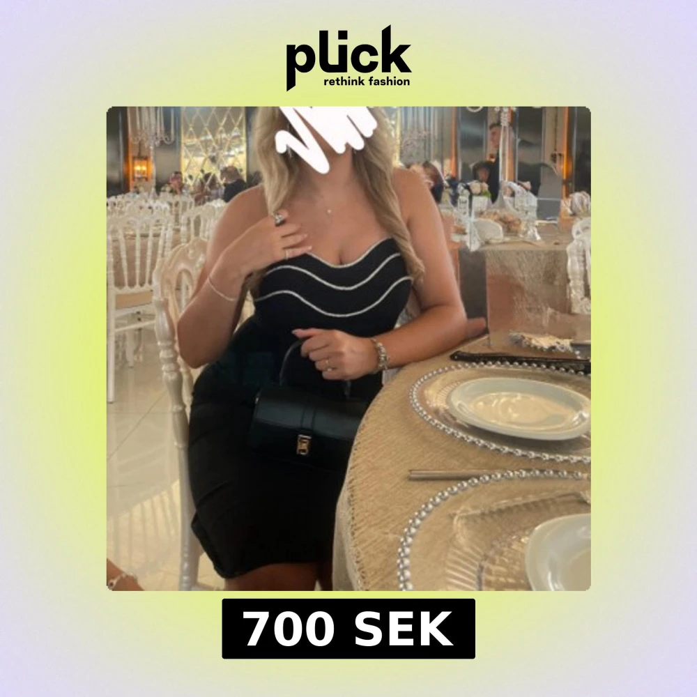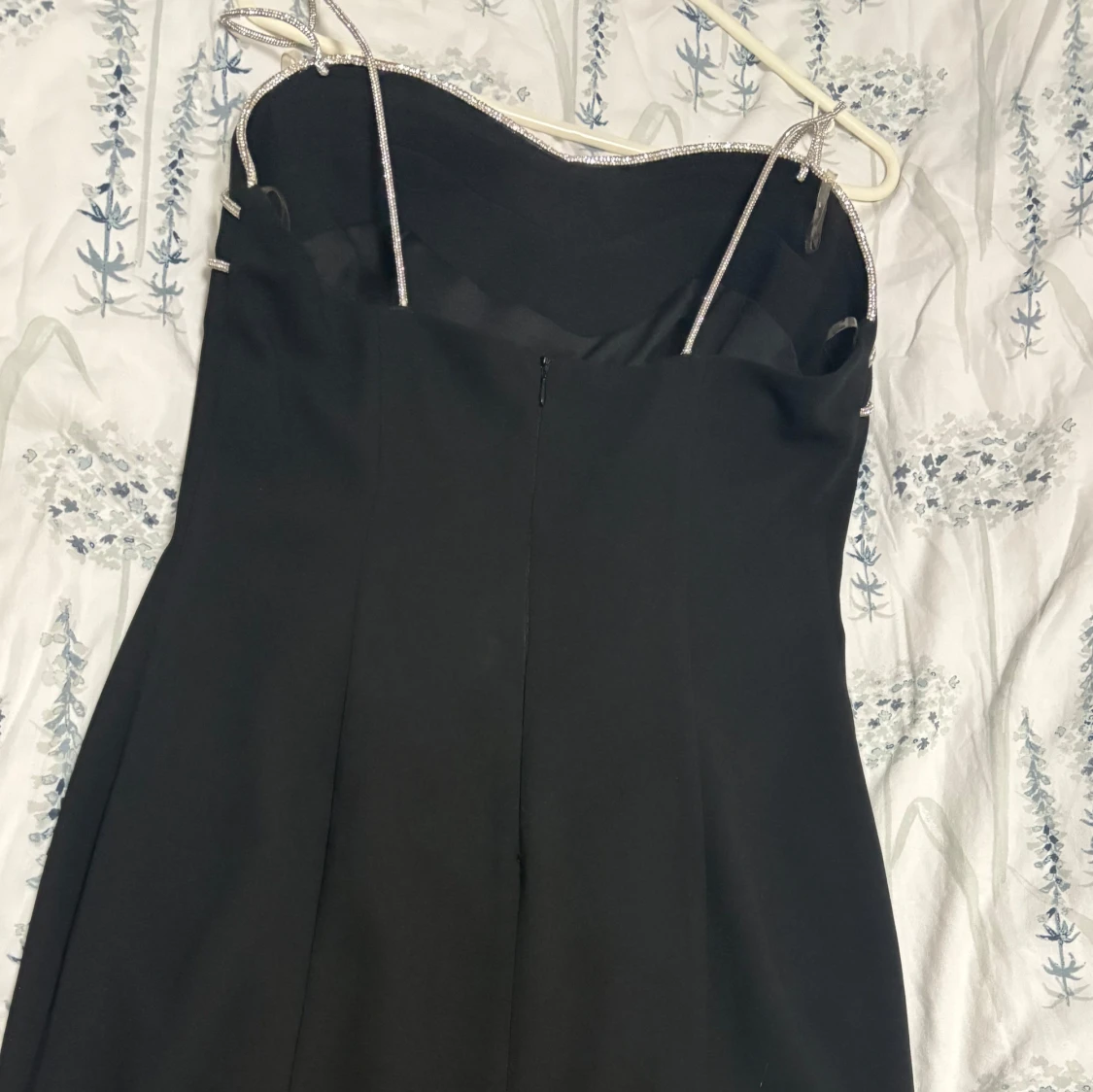 Supersnygg svart klänning med tunna axelband och vågformade strassdetaljer längs bysten. Klänningen har figurnära passform och dragkedja i ryggen. Perfekt för dig som vill sticka ut med en elegant och trendig look. Används en gång