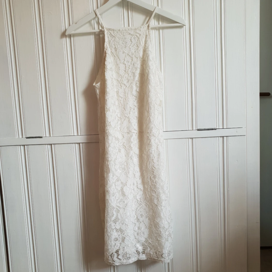 Superfin vit klänning som inte gör sig rättvis på bild. Mycket finare i verkligheten! Köptes till studenten men denna var för liten till mig så denna är helt oanvänd! Köptes ny för ca 250-300kr. 150kr+frakt