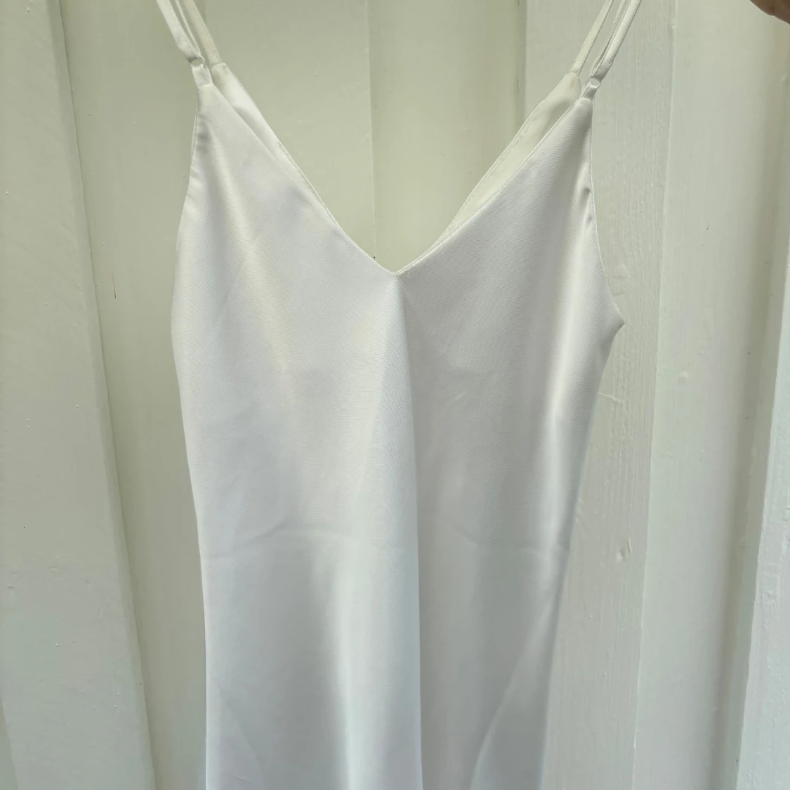 Supersnygg vit satinklänning med smala axelband och v-ringning från Bikbok. Framtill finns en knytning och den är lite figursydd. Har använt ganska mycket men inte så mycket defekter på klänningen. Den är i storlek xs. Pris kan diskuteras & skriv privat vid frågor.💓