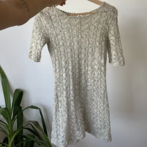 Stickad klänning i grått/beige. Väldigt kort på mig men tror man kan få till det riktigt nice med svarta cykelbyxor under och feta boots!!!