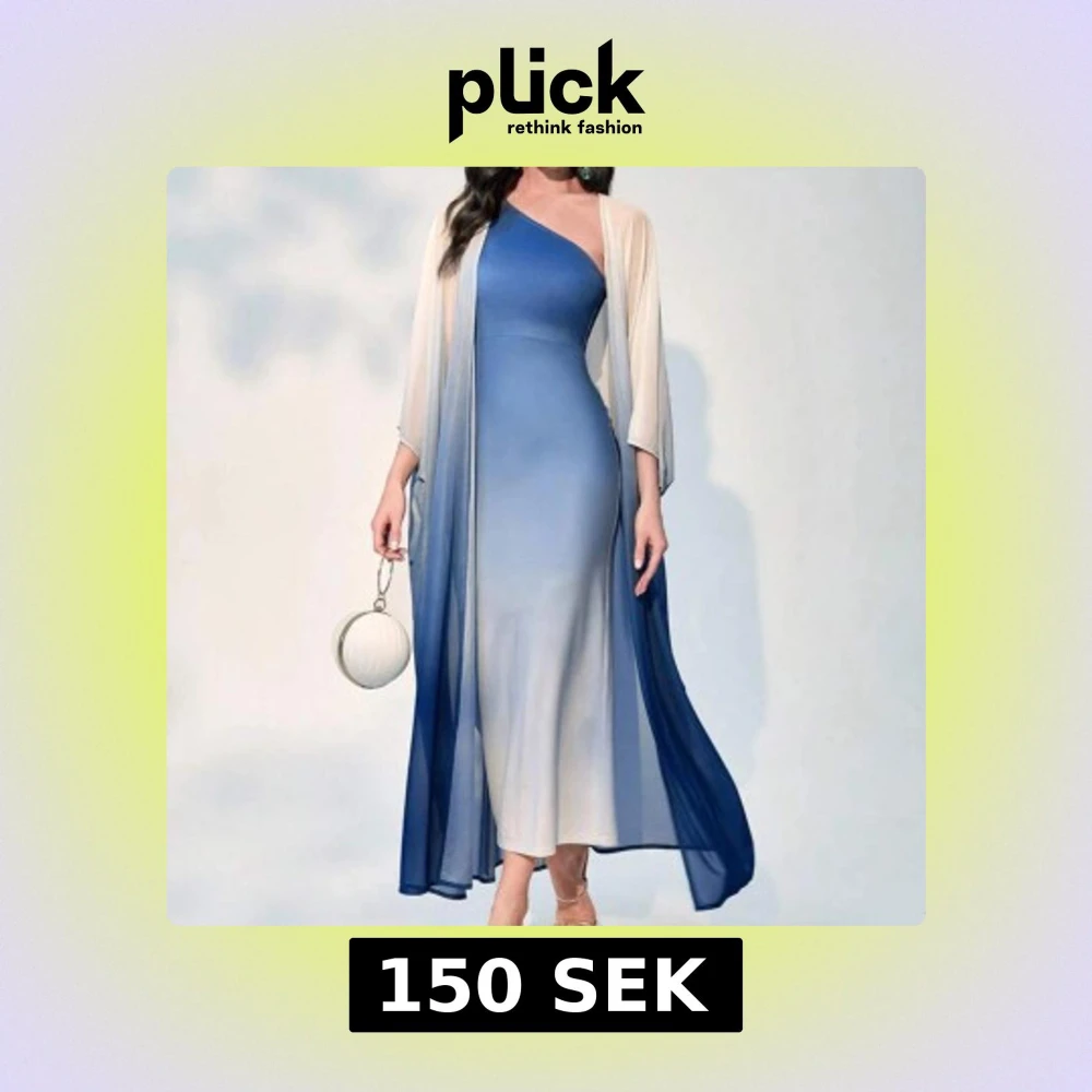 Elegant blå SET långklänning med en one-shoulder design och vacker ombre-effekt som går från ljus till mörk blå. Klänningen har en luftig, transparent överdel som ger en extra dimension till looken. Perfekt för en stilfull kväll.