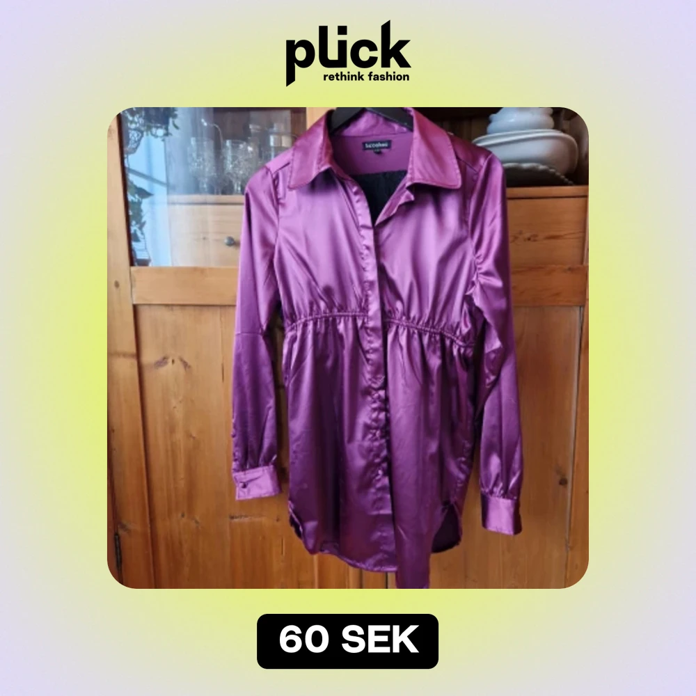 En skjortklänning/tunika i en fin lila färg med knappstängning och knappar i ärmsluten och lite slits i sidorna. Storlek 36/38, tycker du jag är dyr så pröva buda. :)