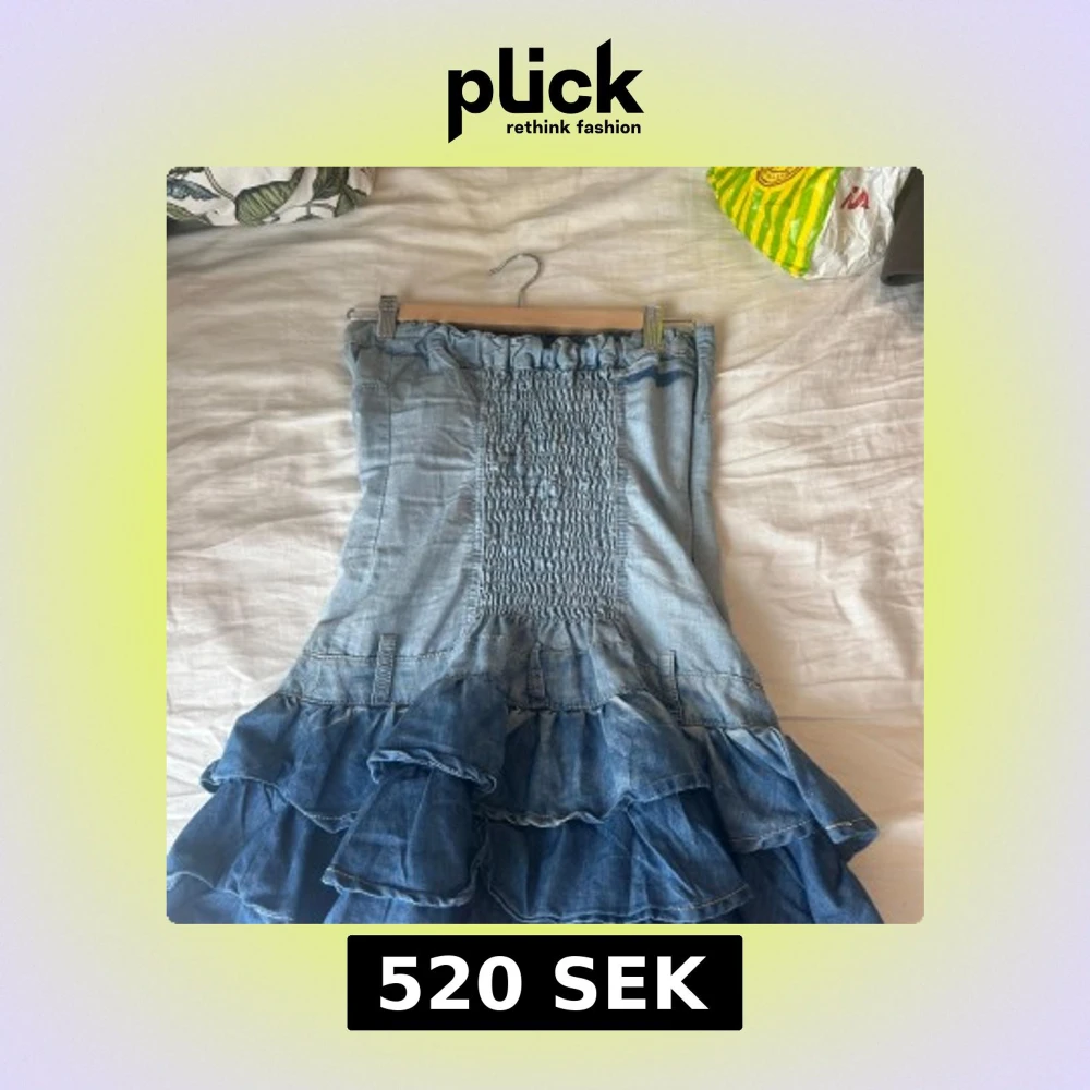 Snygg axelbandslös jeansklänning med volanger i olika blå nyanser. Klänningen har knappar framtill och en smockdetalj på baksidan för bättre passform. Perfekt för en avslappnad stil med en touch av denim.