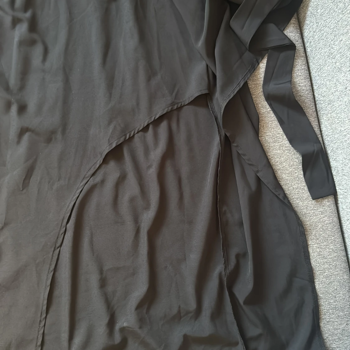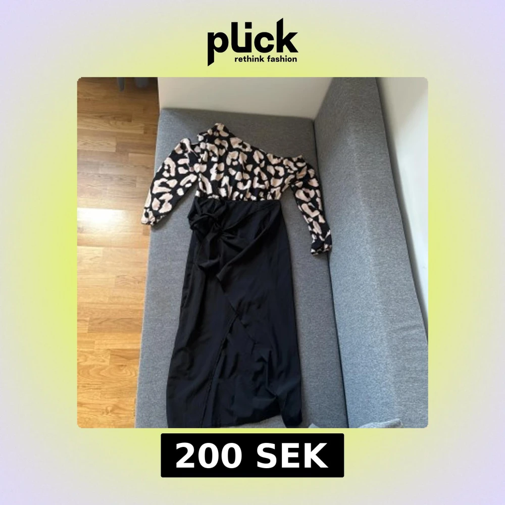 Snygg långklänning med svart kjol och omlott-detalj samt knyt i midjan. Överdelen har beige och svart leopardmönster och långa ärmar med resår vid handlederna.