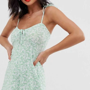 Jättegullig grön blommig klänning från Boohoo, storlek 36 Oanvänd Stretchigt material, snygg urringning, knytbar vid både axlar och byst så justerbar i storleken, passar nog både s och m