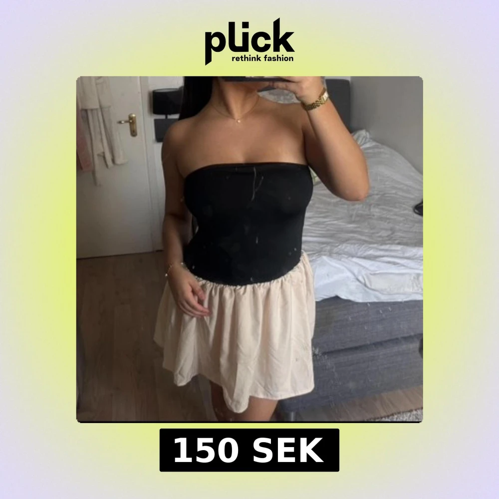 Snygg axelbandslös klänning med svart överdel och beige kjol. Helt oanvänd.