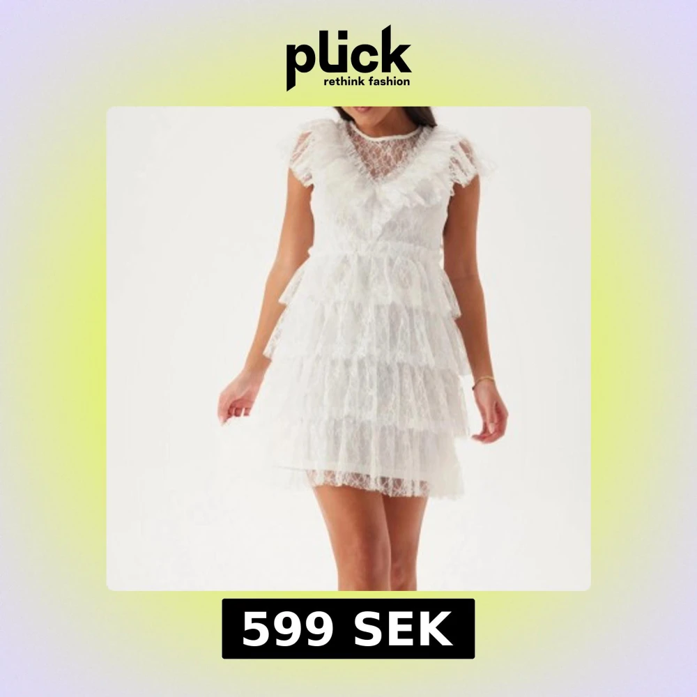 Superfin vit kortklänning i spets med flera lager volanger och v-ringad detalj upptill. Säljer för 599 och kostar 900 som ny och bara använt den en gång. Den är slut i storleken xs på hemsidan.