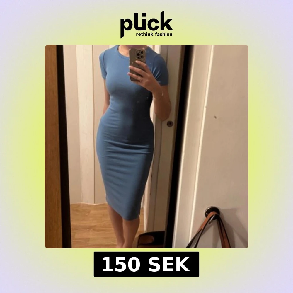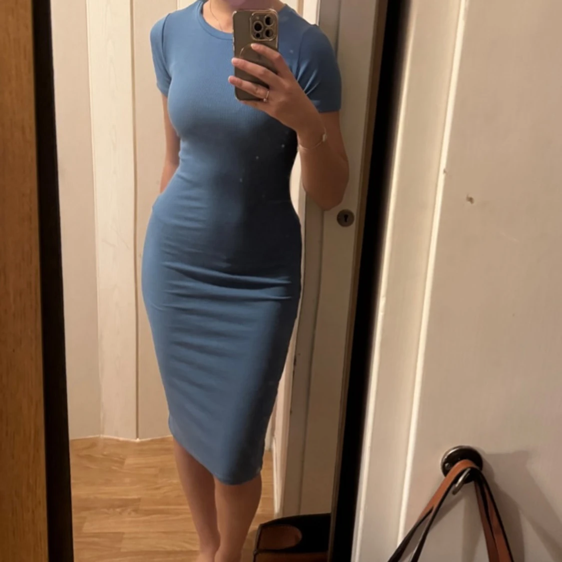 Säljer en snygg blå ribbad klänning med korta ärmar och rund hals. Klänningen har en tight passform som framhäver figuren och är i midilängd. Perfekt för dig som gillar enkel och stilren design.