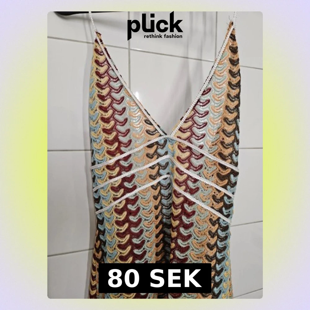 Lång klänning för strand eller sommaren. Mönstrad och med halterneck. Den är inte heltäckande, utan mer som en beach cover-up. Det finns en dold dragkedja i sidan. Det finns ingen storlekslapp, men uppskattar den till strl M.