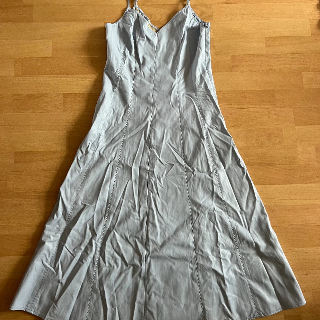 Ljusblå klänning i strlk 38 (stor i storleken). Läder-aktigt material. Aldrig använd, lappar kvar.