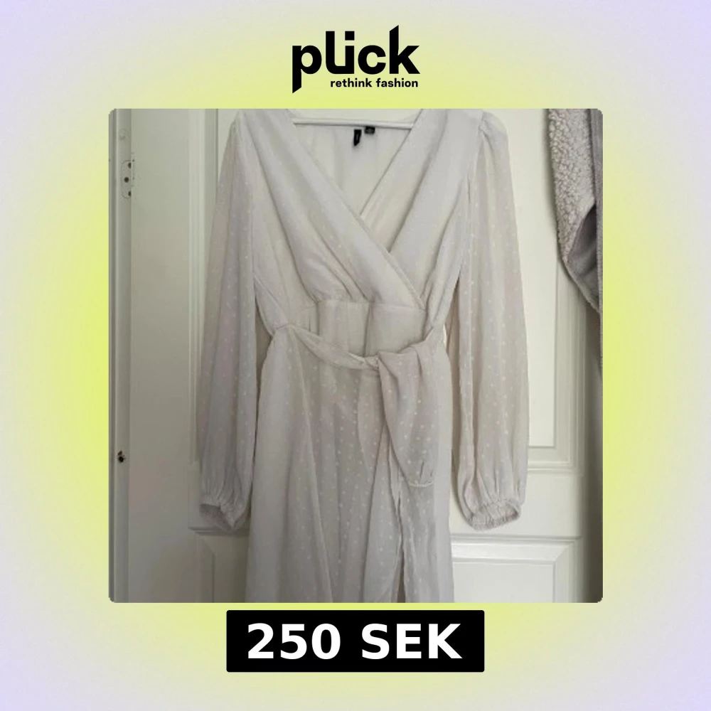 Säljer en vit omlottklänning med knytband i midjan och diskret prickigt mönster. Klänningen har långa ärmar med resår vid ärmslut och en v-ringad omlottdesign. Perfekt för sommarens tillfällen!