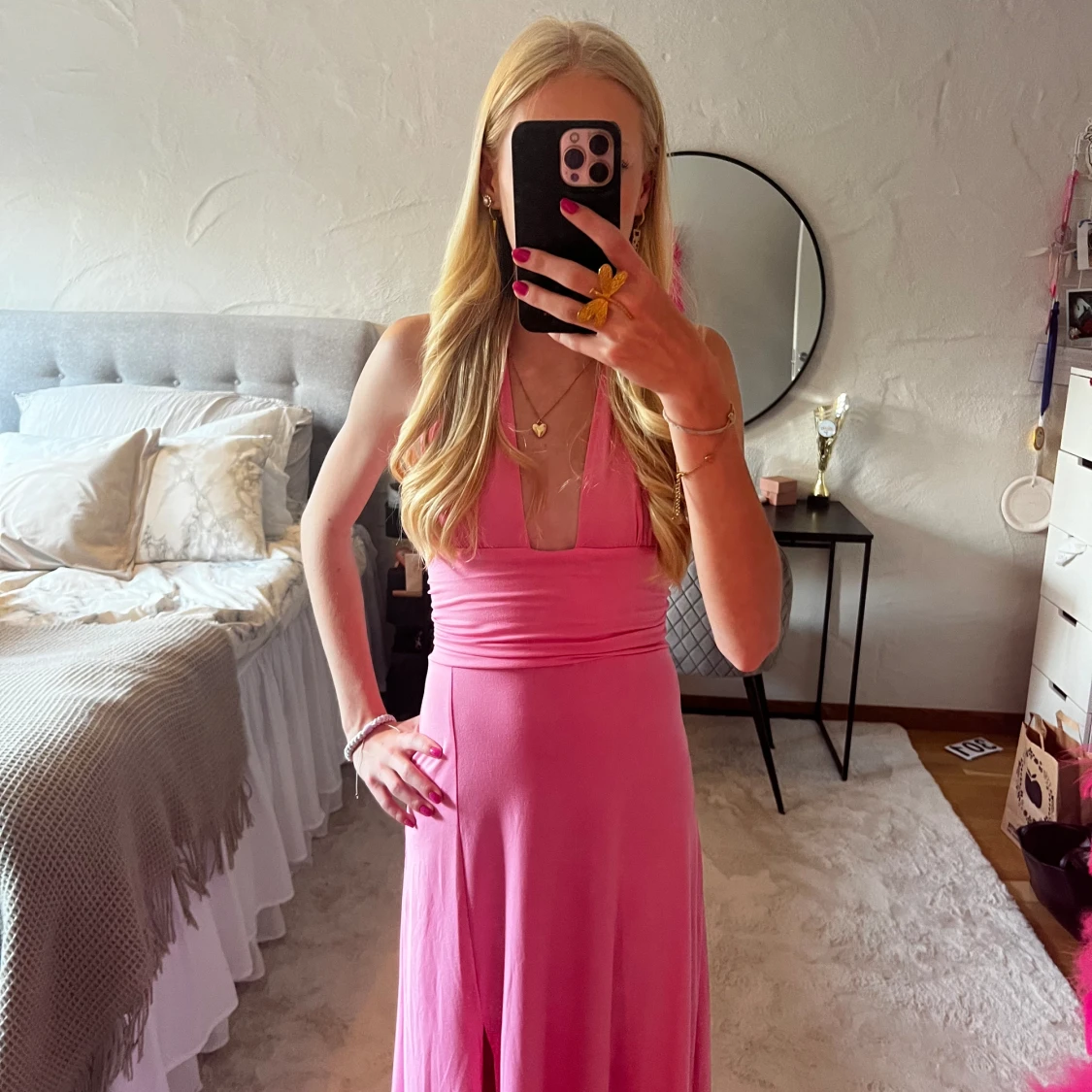 En superfin klänning i mjukt och strechigt material. Banden i ryggen gör att man kan reglera storleken. Helt oanvänd.