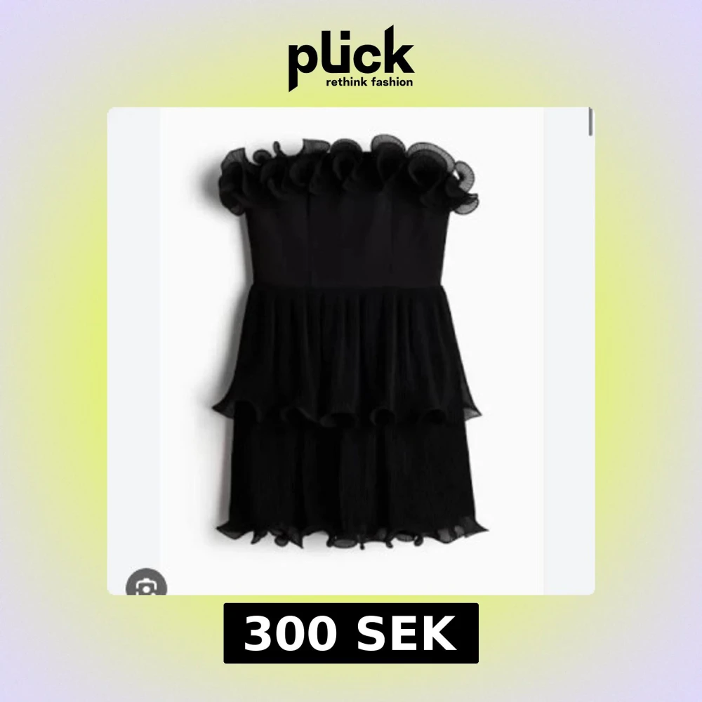 Aldrig använd med lappen kvar!! ❣️originalpris 800kr Supersnygg svart axelbandslös klänning med volanger upptill och i två lager på kjolen. Klänningen har en kort och figurnära passform med romantiska detaljer och en lätt, luftig känsla.