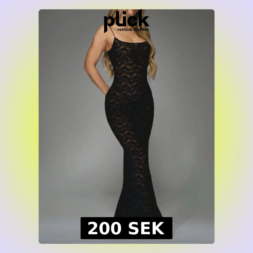 Supersnygg svart långklänning i spets med smala axelband och figurnära passform. Klänningen har transparent spetsmönster och lätt glittrande detaljer.