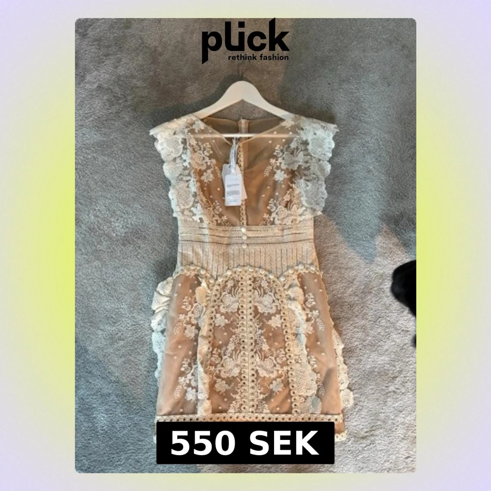 Superfin kortklänning i champagnefärg med detaljerad spets och broderade blommor. Klänningen har volang vid axlarna, knappar framtill och markerad midja. Transparenta partier och vackra spetskanter ger en romantisk vibe. Perfekt för sommarens alla tillfällen!