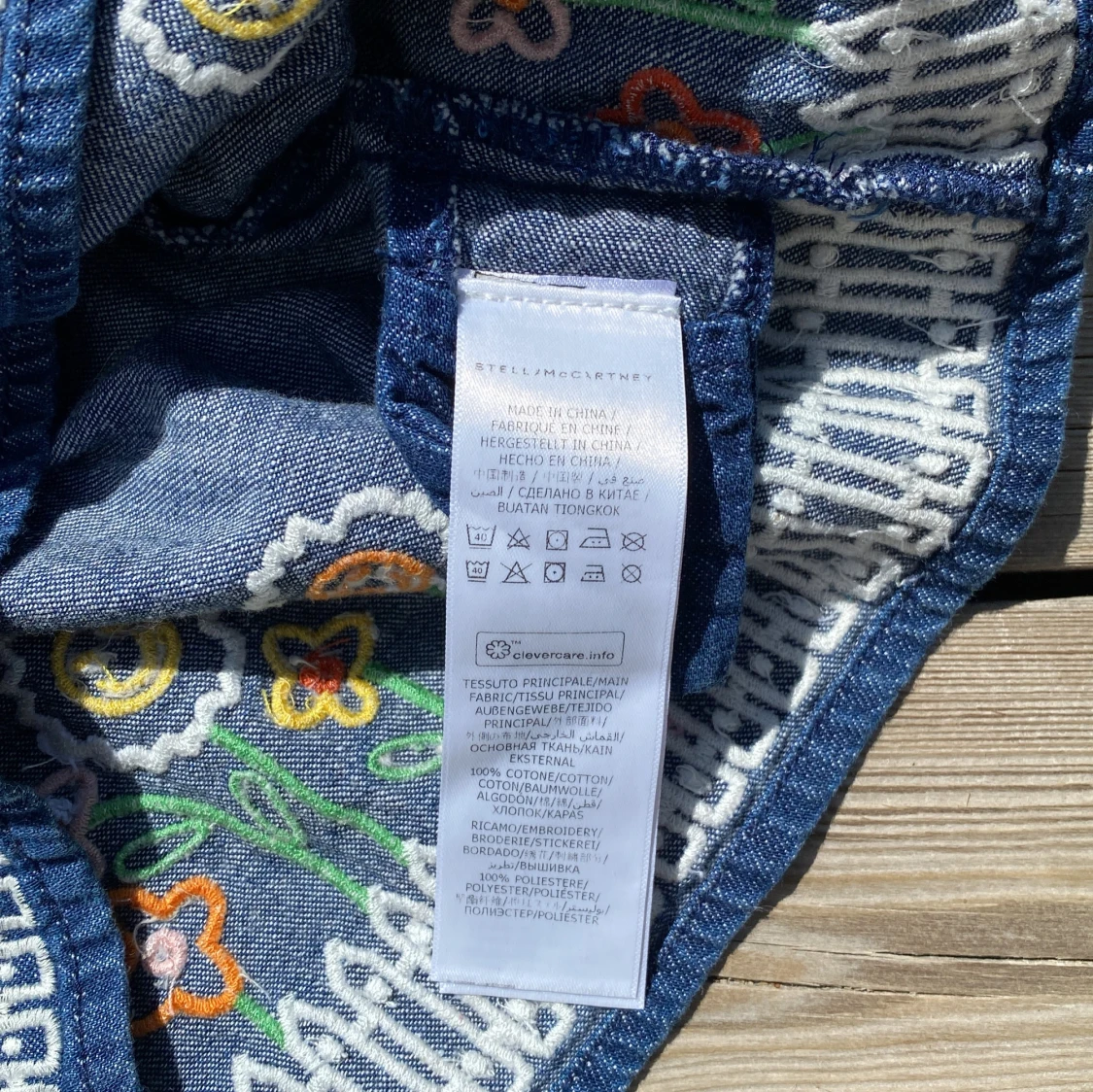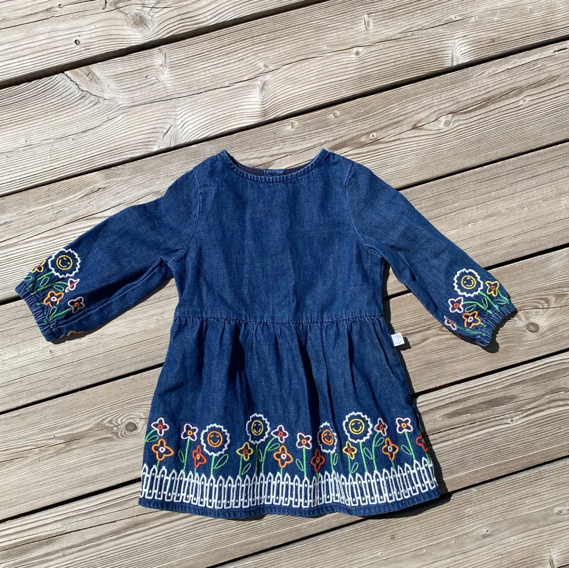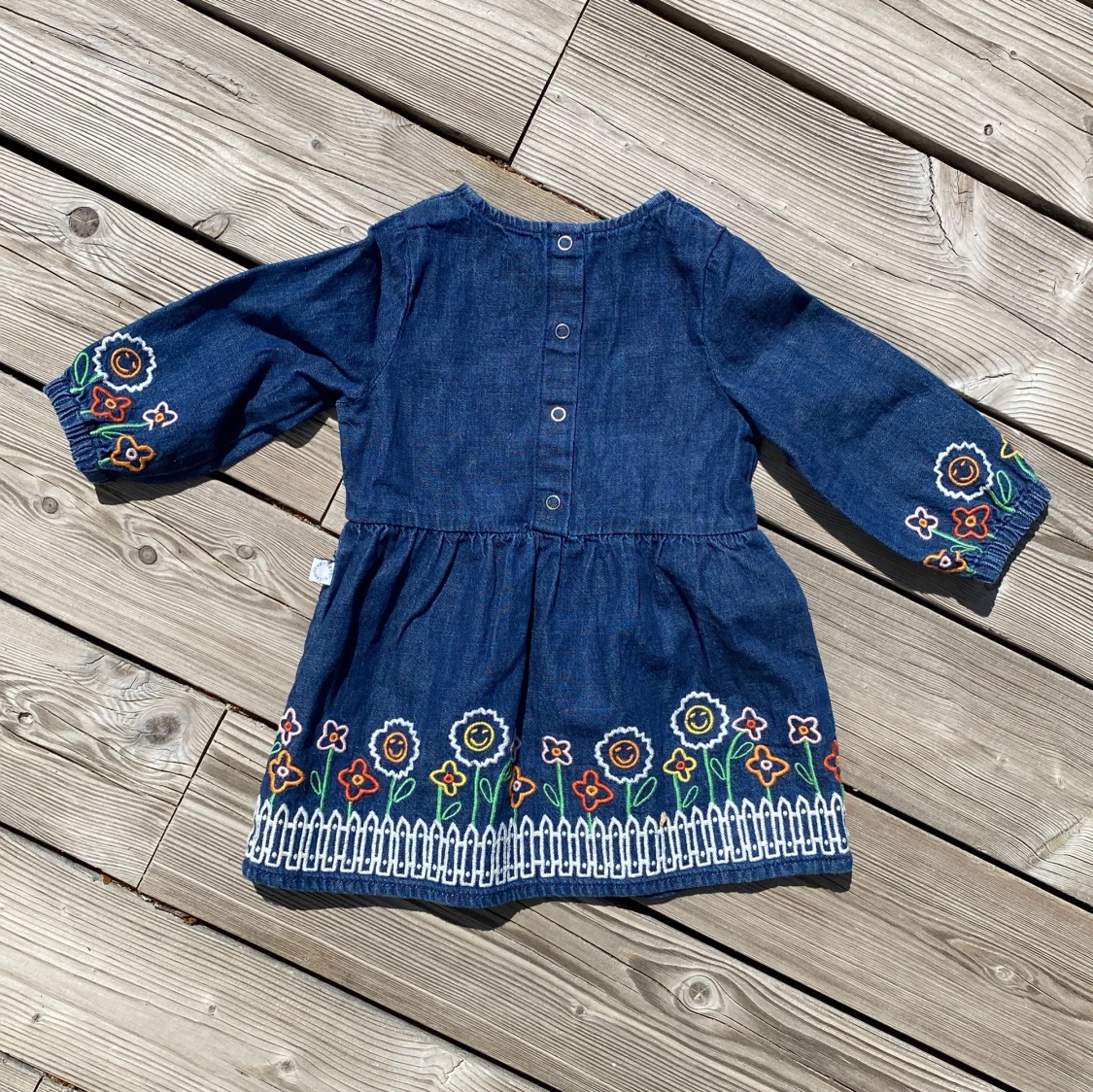 Supersöt blå jeansklänning från Stella McCartney med färgglada broderade blommor och staketdetalj nertill. Klänningen har trekvartsärm och knappar i ryggen.