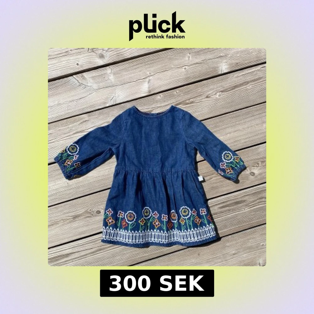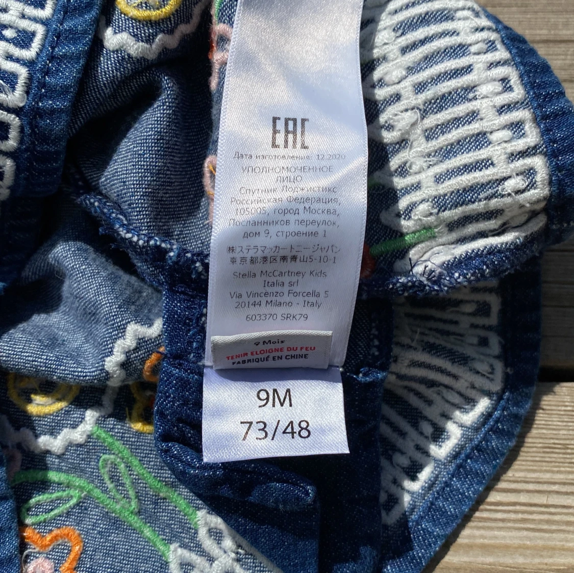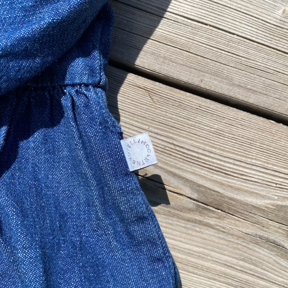 Supersöt blå jeansklänning från Stella McCartney med färgglada broderade blommor och staketdetalj nertill. Klänningen har trekvartsärm och knappar i ryggen.