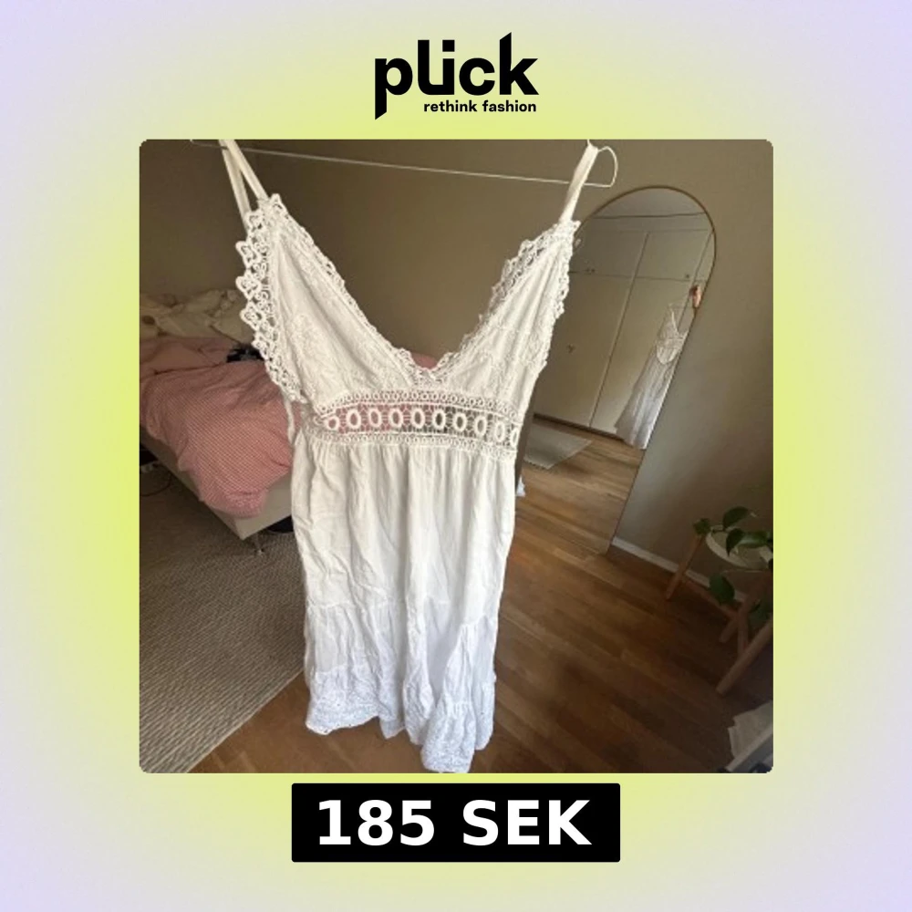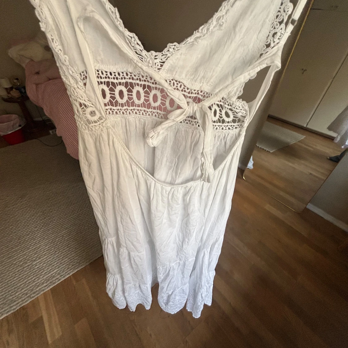 Superfin vit långklänning med spets och broderade detaljer, omlott i ryggen med knytband. Klänningen har v-ringad hals och axelbandslös design, samt dekorativ spets vid midjan och nederkant. Perfekt för sommarens alla tillfällen! Köpt i Italien.