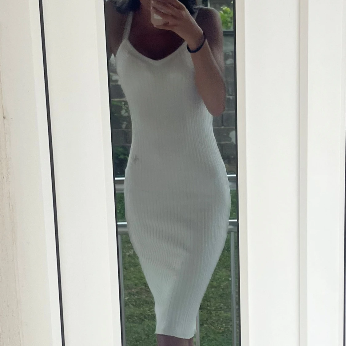 Säljer en vit, ribbad klänning med smala axelband och figurnära passform. Klänningen är midilång och har en enkel, stilren design som passar perfekt till varma dagar. Materialet är stretchigt och bekvämt.