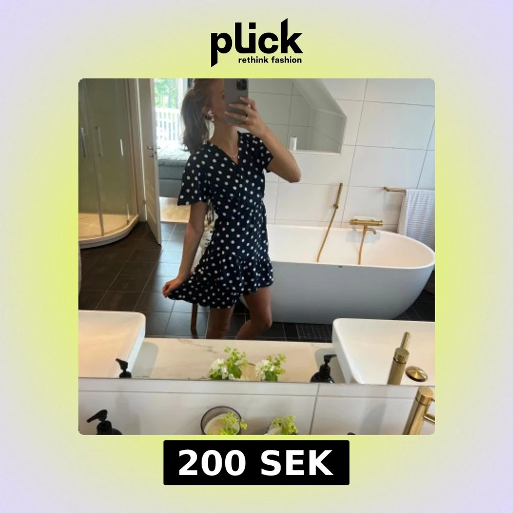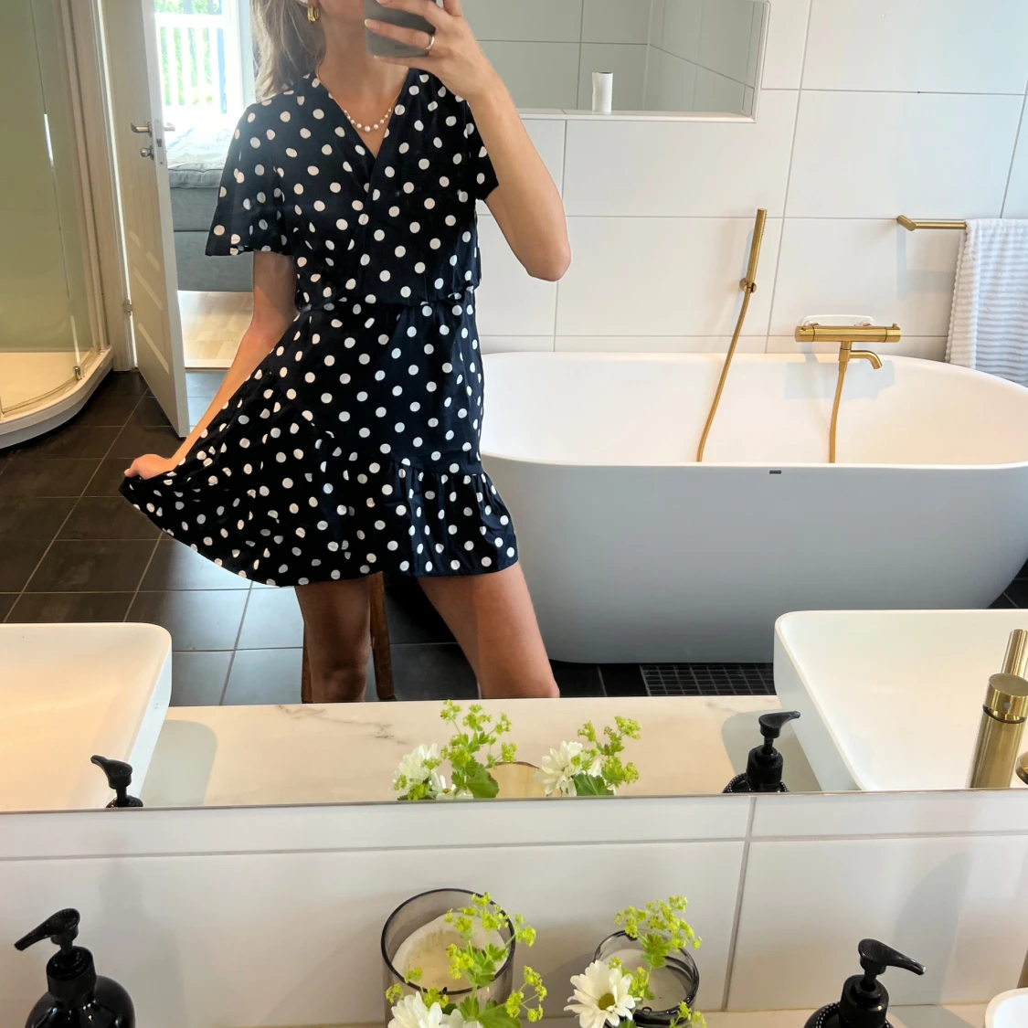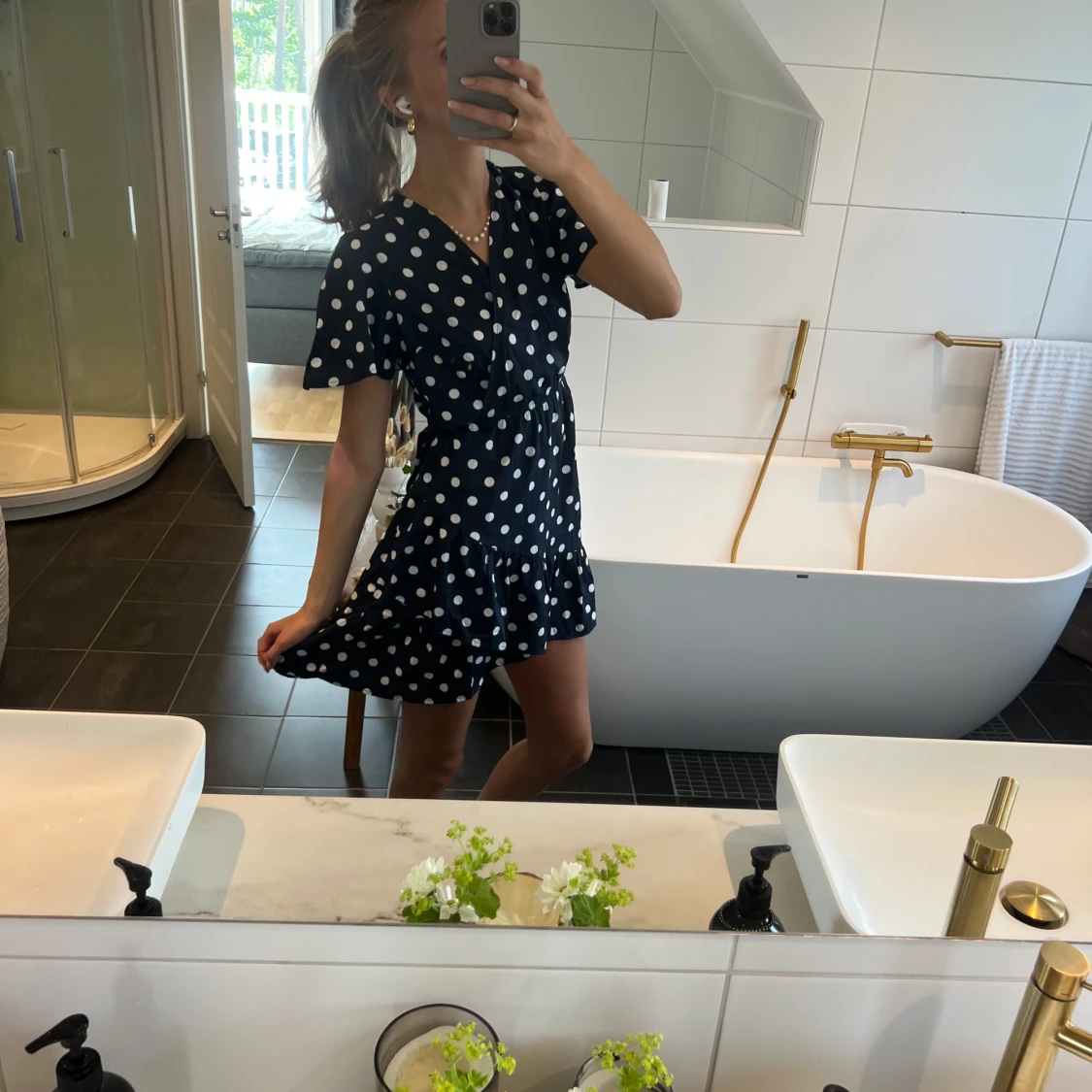 Supersöt marinblå kortklänning med vita prickar och volang nertill. Klänningen har v-ringning och korta ärmar. 💙💙