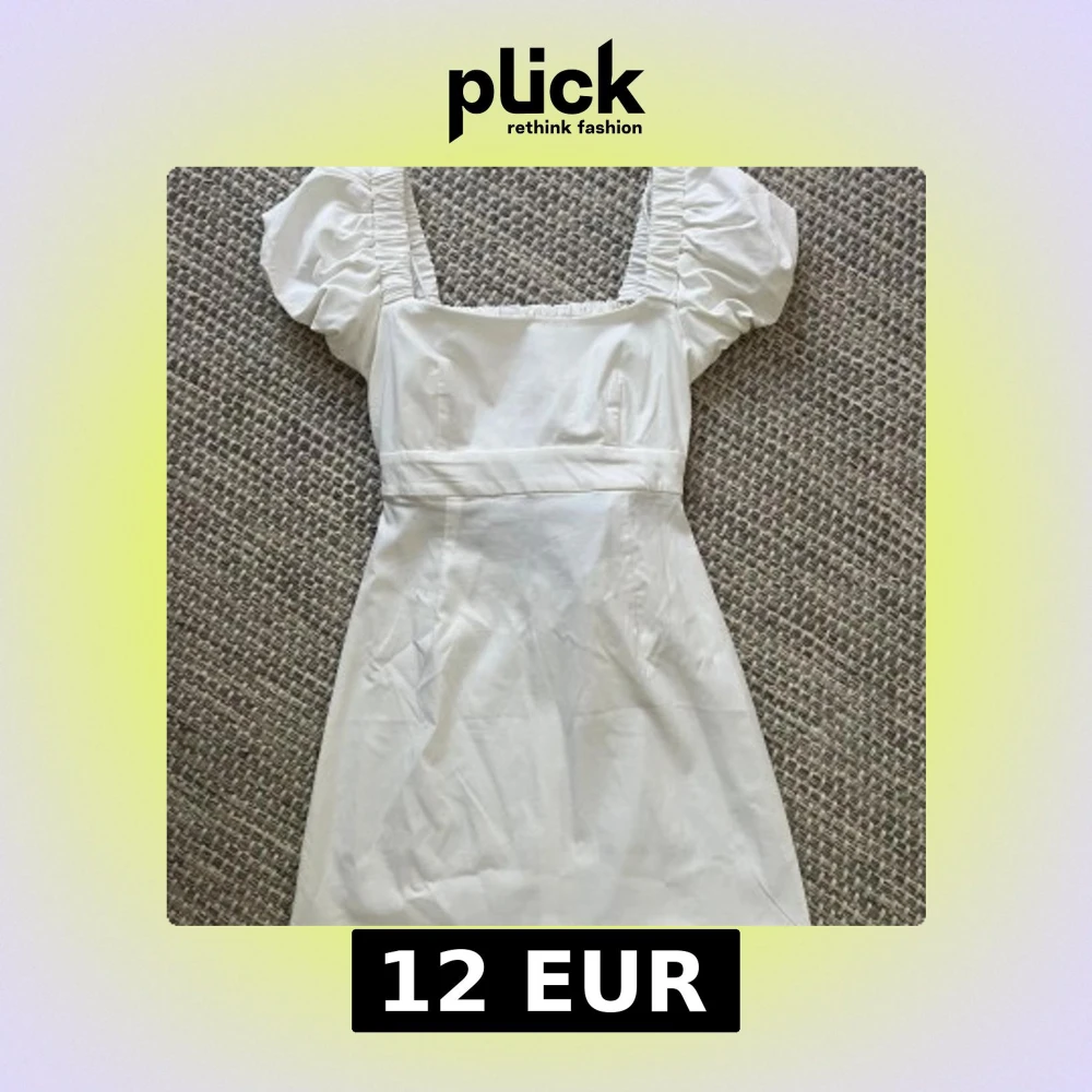 Superfin vit kort klänning från Stradivarius med puffärmar och fyrkantig ringning. Klänningen har markerad midja, rynkade detaljer vid axlar och rygg samt dragkedja bak. Perfekt för sommarens alla tillfällen!