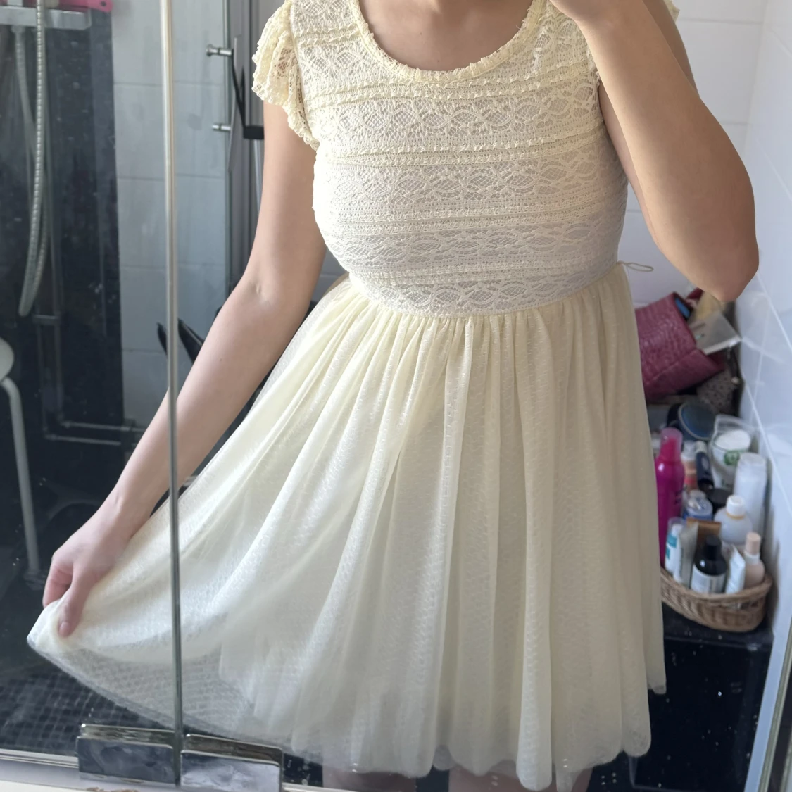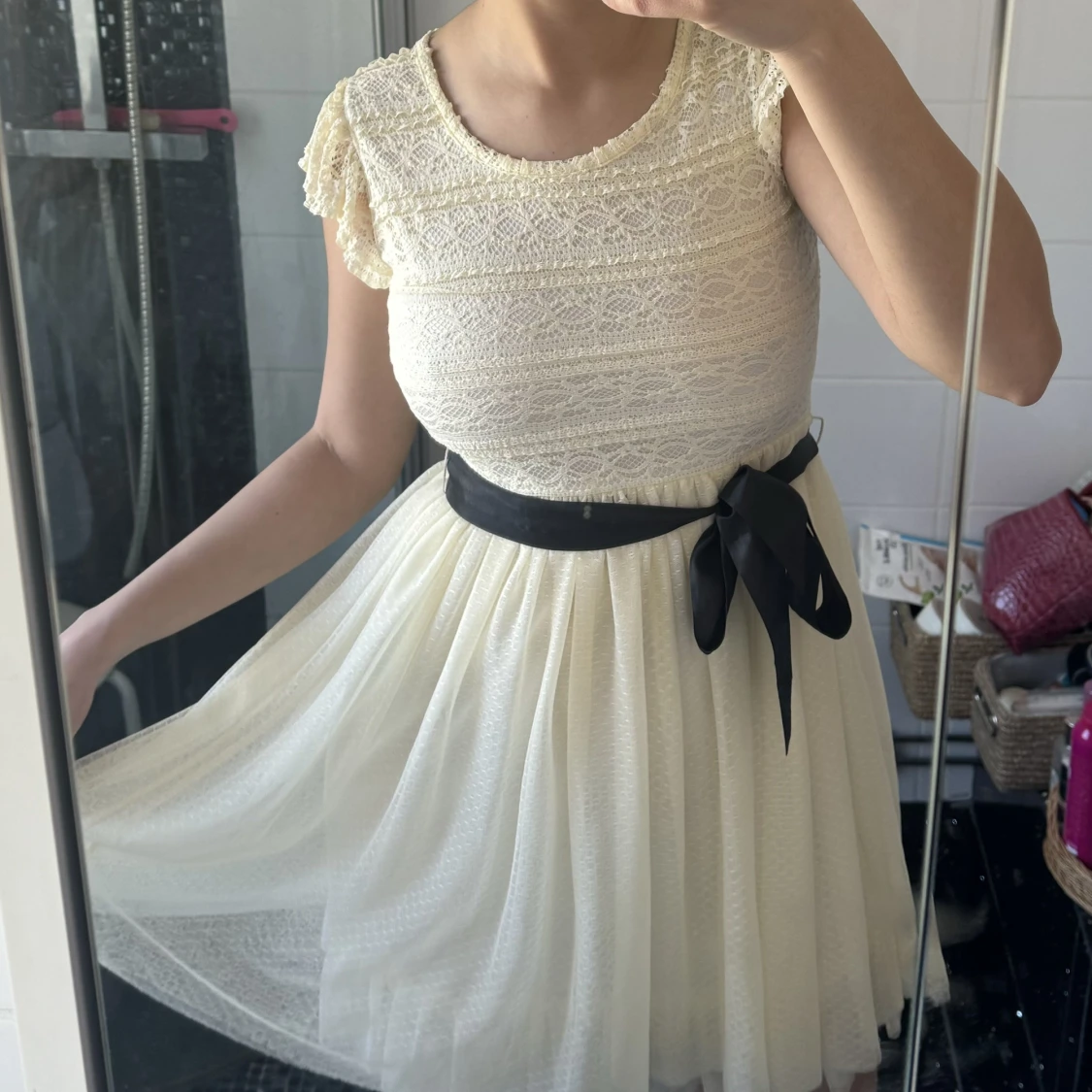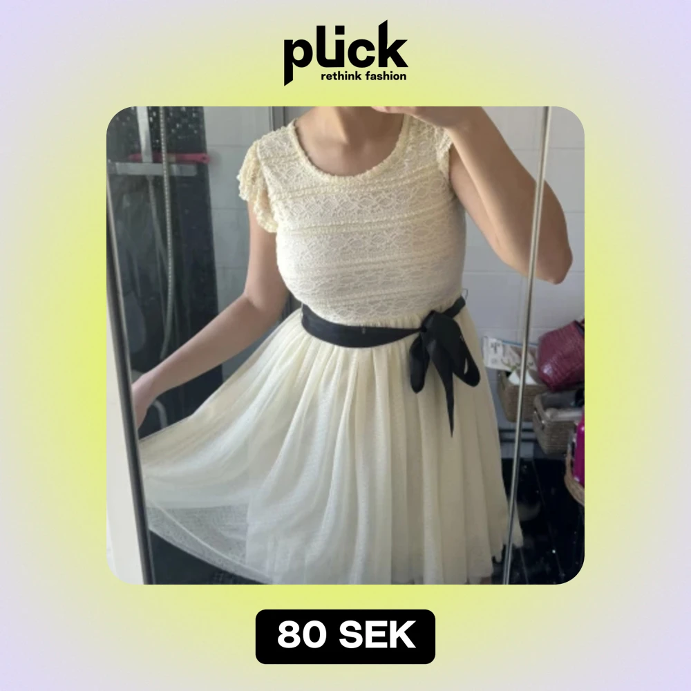 Supersöt cremevit klänning, perfekt till sommaren! Använd ett fåtal gånger. Kommer med svart siden band som man kan ta bort. Storleken är 156-164 men passar mig Som är S/M och är 167 cm lång