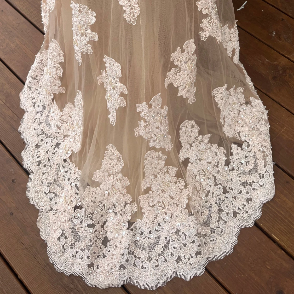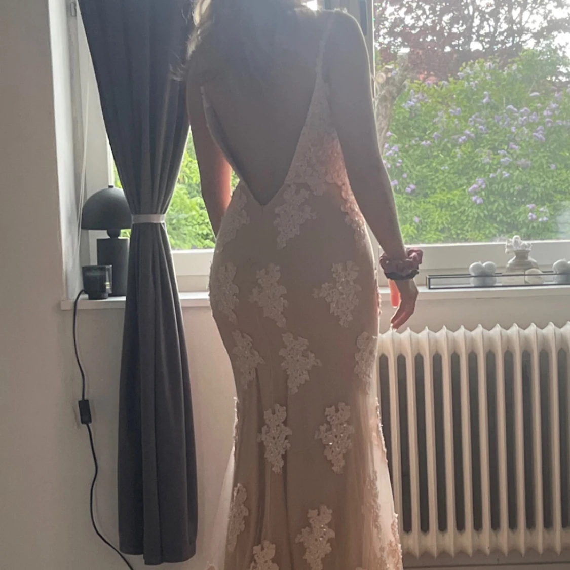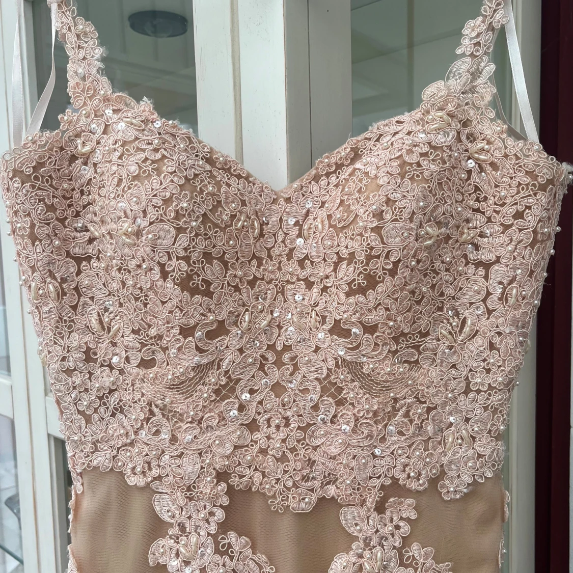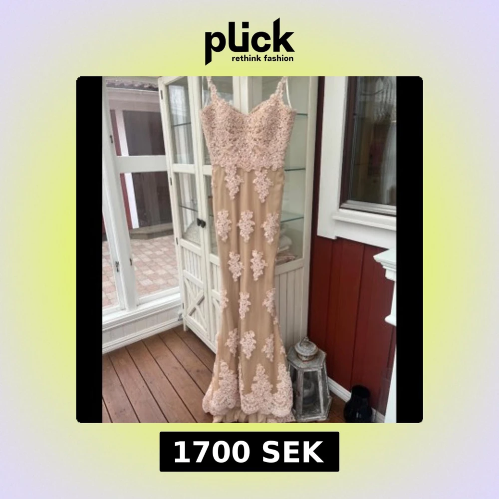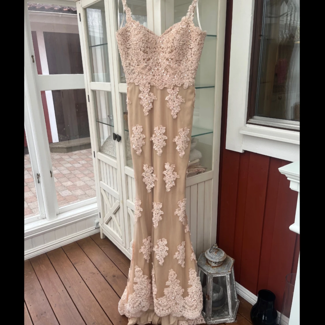 Elegant långklänning/balkläning i champagnefärg med vackra spetsdetaljer och smala axelband. Klänningen har en figurnära passform och är dekorerad med blommönster i spets över hela tyget. Klänningen har även en djup rygg som göra ty klänningen börjar i mitten av ryggen. Perfekt för en speciell kväll!! Klänningen passar alla mellan xs till s jag själv har storlek XS, S samt kan ha M och klänningen passar perfekt på mig. Pris går att diskuteras och fler bilder fins vid intresse. ✨🌸