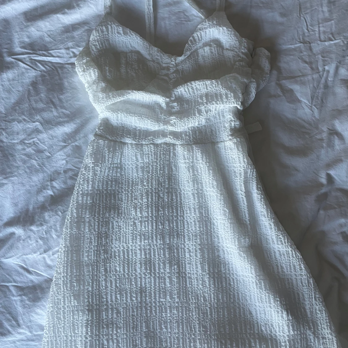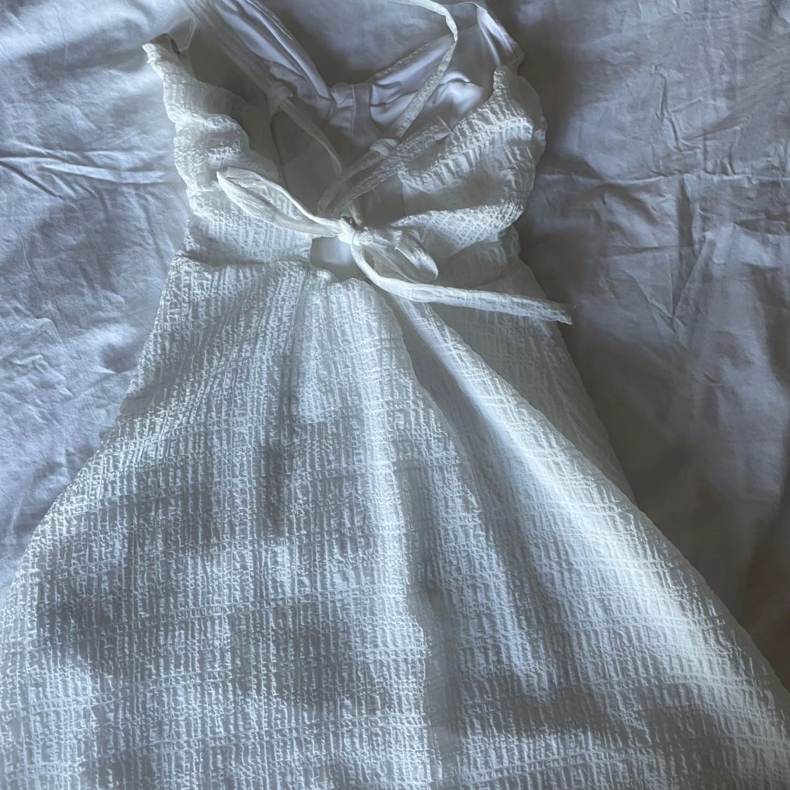 Supergullig vit klänning med korsrygg, perfekt till studenten!! Endast använd en gång så den är i superfint skick, skriv om ni vill ha fler bilder 🩷