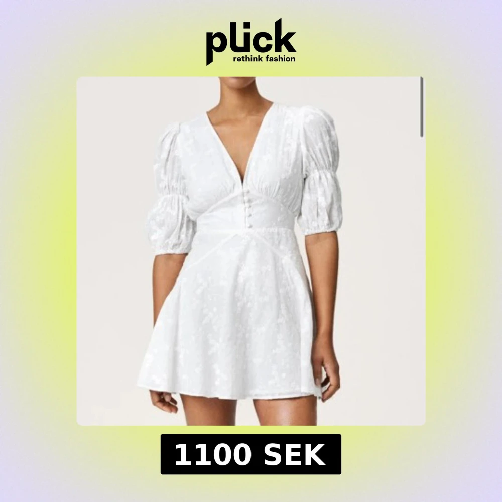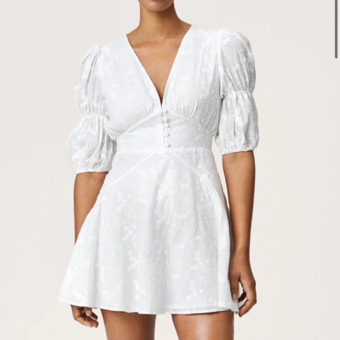 Superfin vit kort klänning med v-ringning, puffiga korta ärmar och knappar framtill. Klänningen har ett subtilt blommigt mönster och markerad midja som ger en snygg siluett. Perfekt för sommarens alla tillfällen!