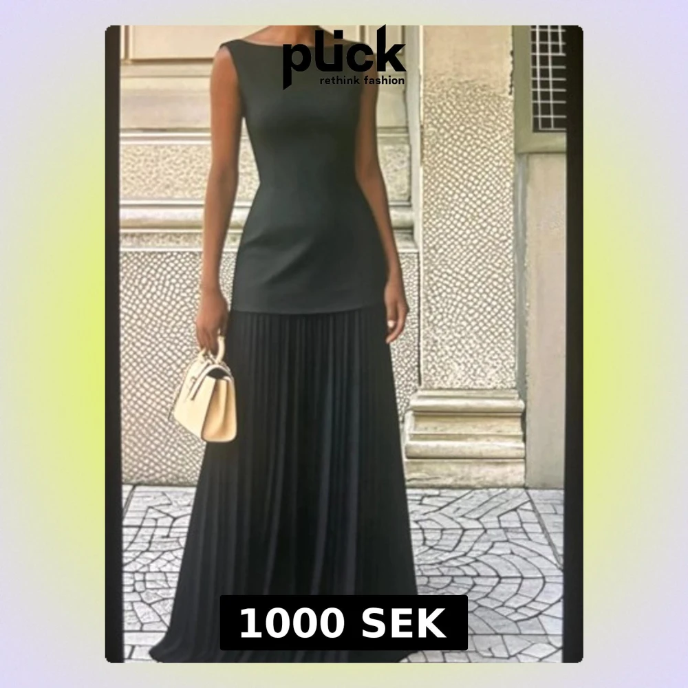 Säljer en elegant svart långklänning med ärmlös design och rundad halsringning. Klänningen har en slät överdel och plisserad kjol som ger ett stilrent och klassiskt intryck. Perfekt för dig som vill ha en tidlös look. Använd endast en kväll