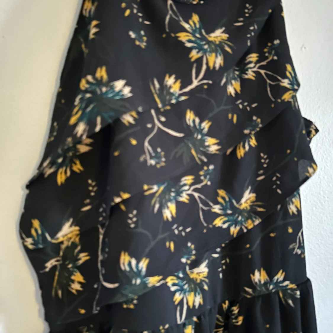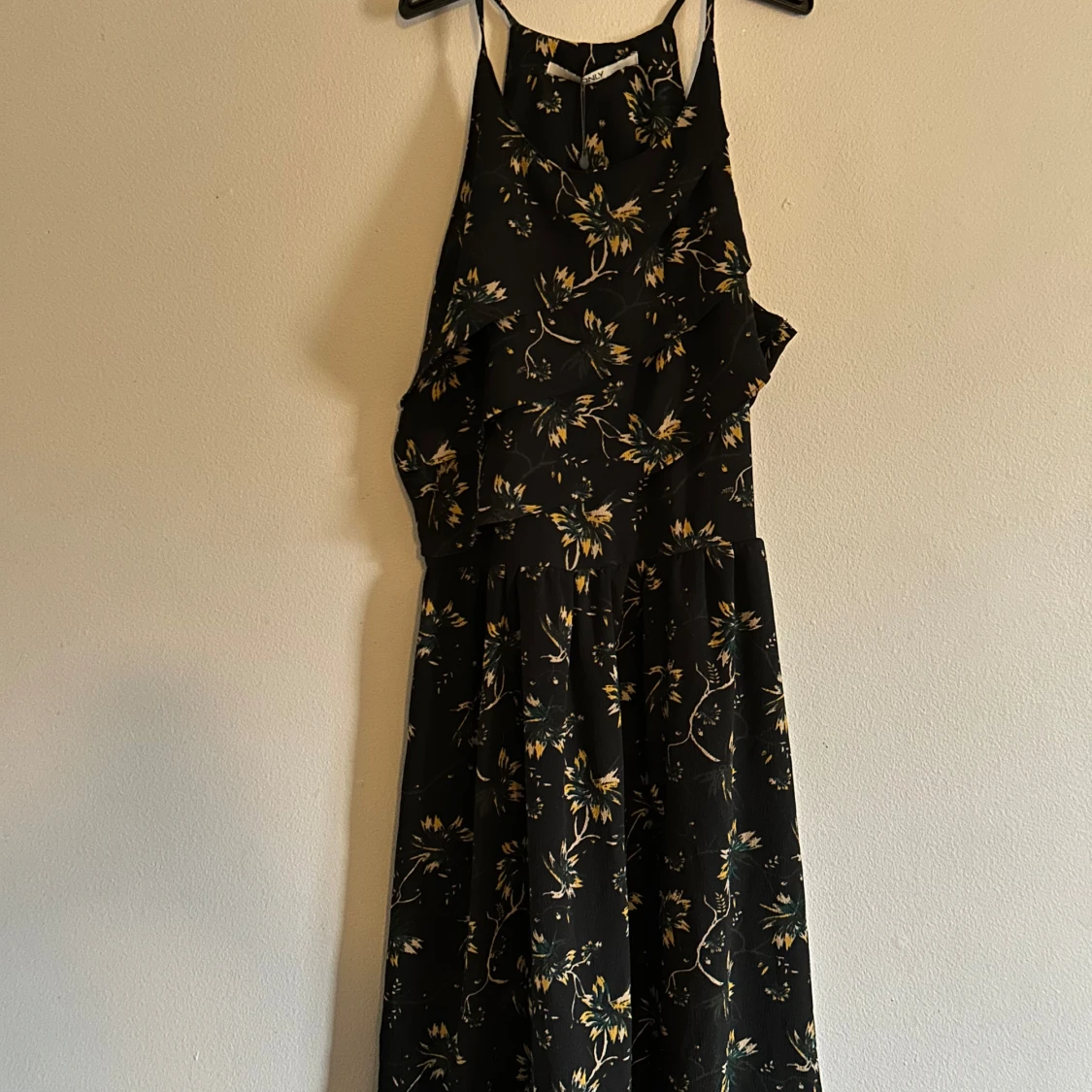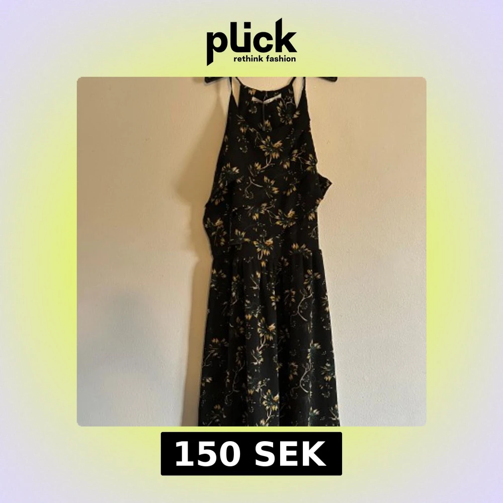 Säljer en svart klänning från ONLY med ett vackert blommönster i gult och grönt. Klänningen har smala axelband och volangdetaljer som ger en romantisk touch. Perfekt för sommarens alla tillfällen!