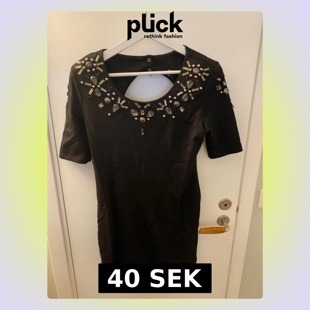Svart festklänning. Lite trådsläpp på några av ”strassen”, därav priset. Går att ta bort om man vill eller sys fast. Har lite vadderade axlar och en innerklänning innanför. Fin öppning vid ryggen. Storlek 40, skulle säga 38/40.