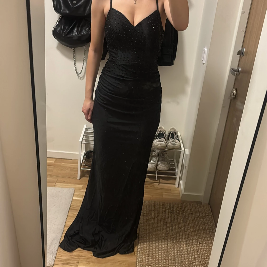 Elegant svart långklänning med smala axelband och glittrande detaljer. Klänningen har en figurnära passform och en v-ringad urringning. Perfekt för bal. Köptes för 1900kr på Zapaka