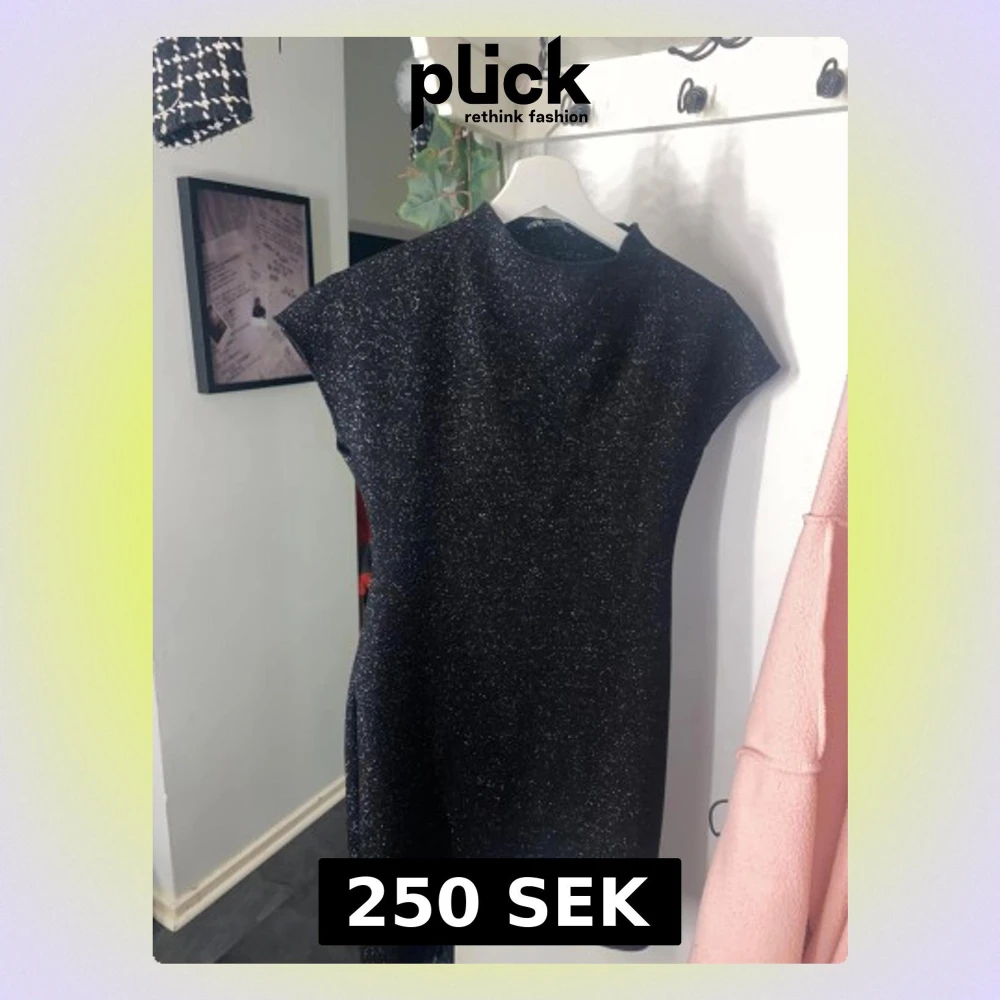 Snygg svart kortklänning med glittriga detaljer och hög hals. Klänningen har en rak passform och är ärmlös med breda axlar. Perfekt för dig som vill sticka ut med lite extra glitter. Materialet känns mjukt och har en skimrande yta.