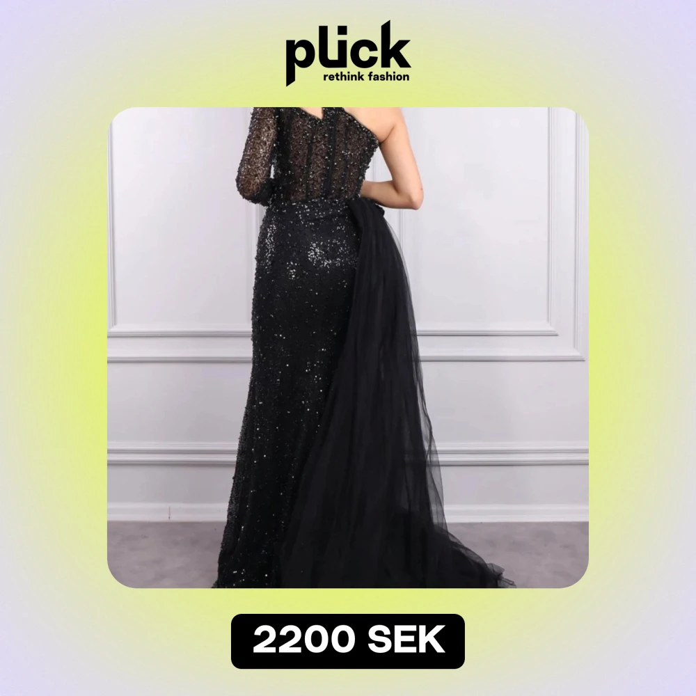 Säljer en fantastisk svart glittrig långklänning med en unik oneshoulder-design. Klänningen har en elegant slits och en dramatisk öppen rygg. Perfekt för bröllopsfesten eller en glamorös bal. Den är i mycket bra skick och redo att glänsa på nästa event! ✨