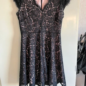 En svart klänning med rosa undertyg. Dragkedja på ryggen. Endast använd en kväll.