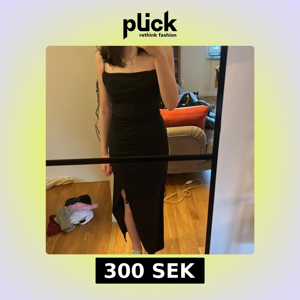 Elegant svart klänning med smala axelband och en stilren slits framtill. Perfekt för en kväll ute eller en speciell tillställning.