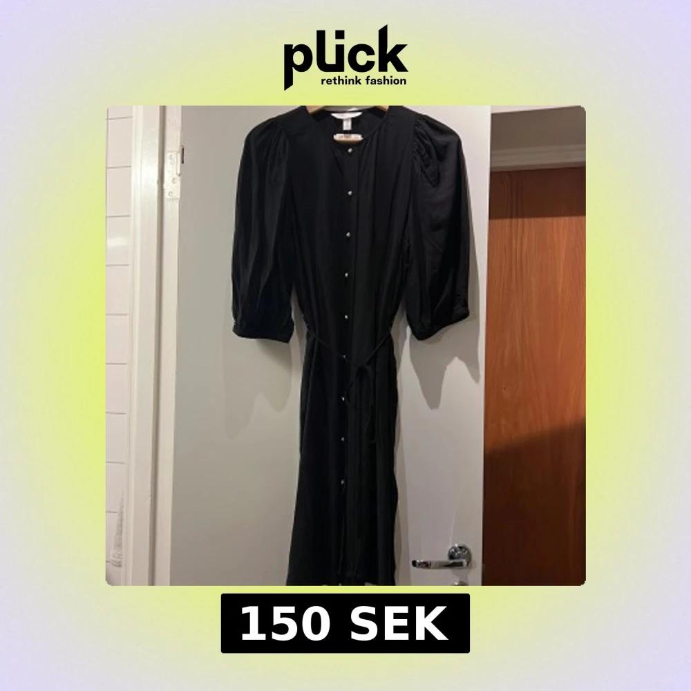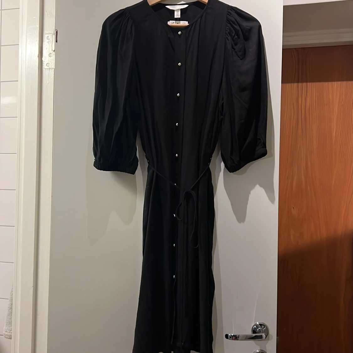 Svart långklänning från H&M i 100% LivaEco viskos. Klänningen har puffiga trekvartsärmar, knappar framtill och ett knytband i midjan för snygg passform. Enkel och stilren design som passar perfekt när du vill känna dig extra chic.